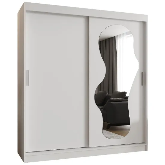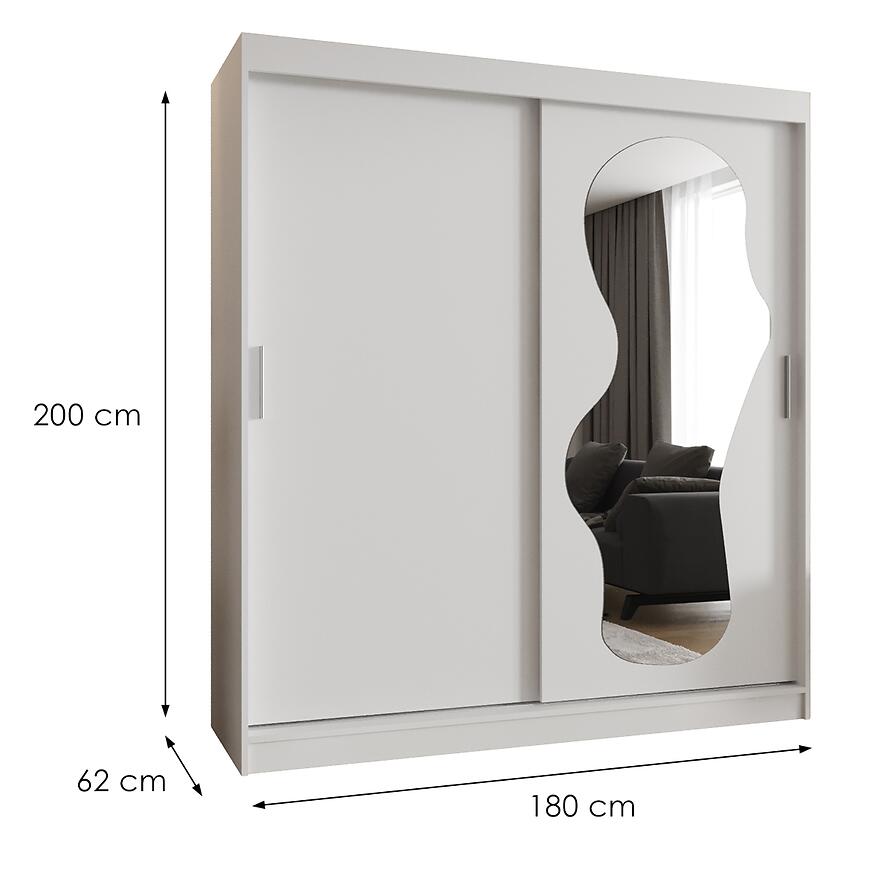 Dzięki wymiarom 200 cm wysokości, 180 cm szerokości i 62 cm głębokości szafa oferuje dużą powierzchnię do przechowywania ubrań, dodatków i innych akcesoriów. Drzwi przesuwne ułatwiają dostęp do wnętrza, a lustro pełni funkcję praktyczną i dekoracyjną, wprowadzając do sypialni poczucie przestronności.
