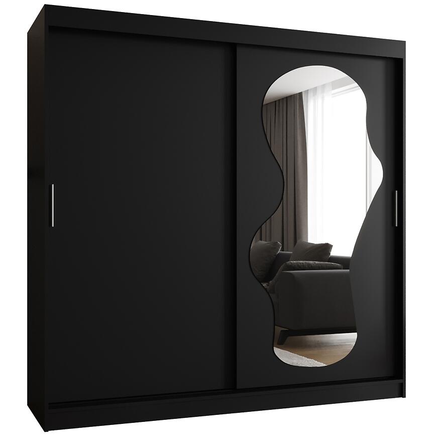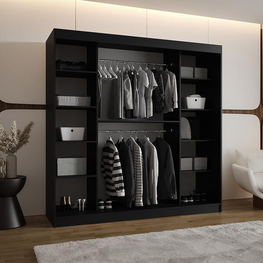 Szafa Ultra 200 w eleganckim czarnym wykończeniu to mebel, który łączy minimalistyczny design z praktycznym przechowywaniem. Dwudrzwiowa konstrukcja z drzwiami przesuwnymi i wbudowanym lustrem pozwala oszczędzać miejsce w sypialni, a jednocześnie wprowadza stylową, wyrazistą aranżację. Matowe fronty i korpus w jednolitym czarnym kolorze tworzą nowoczesny i harmonijny efekt, pasujący do wnętrz utrzymanych w ciemnej lub kontrastowej kolorystyce.