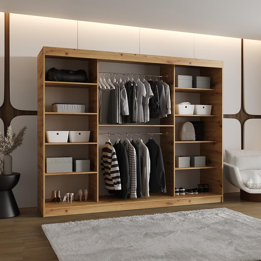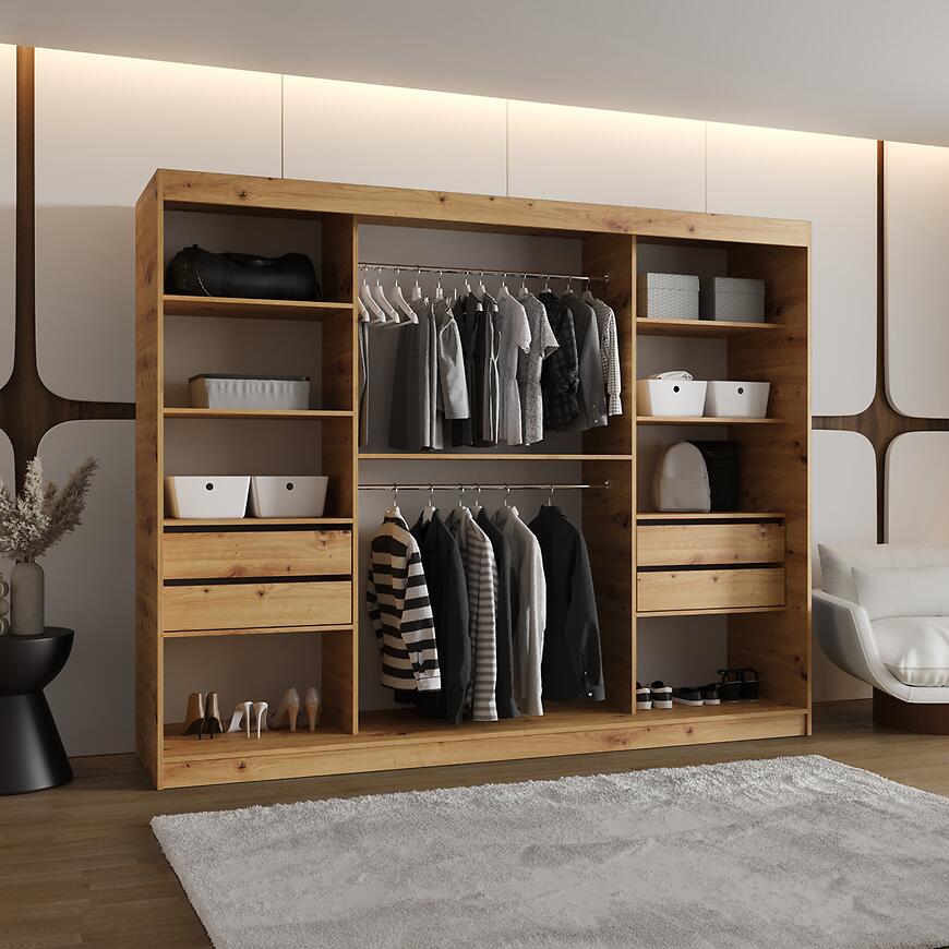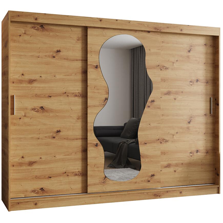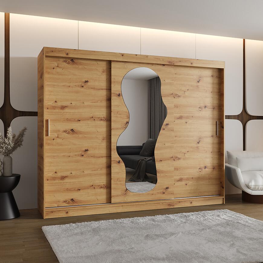 Szafa Ultra 250 w wybarwieniu artisan to elegancki mebel do nowoczesnej sypialni, łączący funkcjonalność z ponadczasowym designem. Trzydrzwiowa konstrukcja z drzwiami przesuwnymi i wbudowanym lustrem pozwala optymalnie zagospodarować przestrzeń i zapewnia wygodny dostęp do ubrań oraz dodatków. Jasne drewnopodobne fronty i korpus w odcieniu dąb artisan tworzą przytulny, naturalny efekt, który wprowadza ciepło do wnętrza.