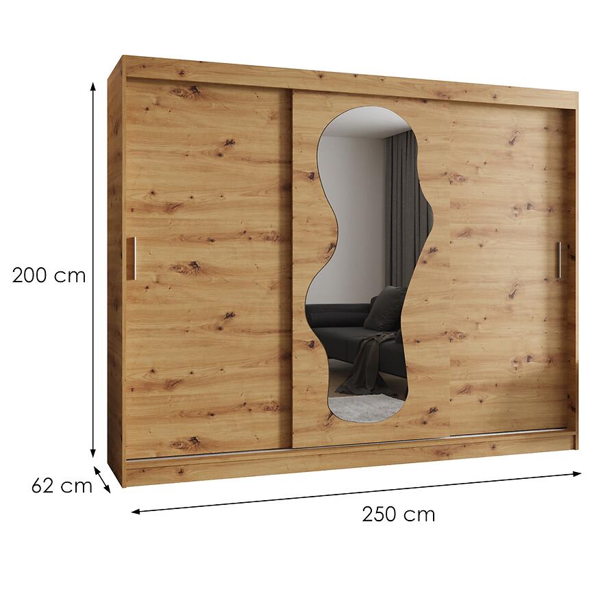 Szafa o wymiarach 200 cm wysokości, 250 cm szerokości i 62 cm głębokości oferuje przestronną przestrzeń do przechowywania odzieży, pościeli i innych akcesoriów. Lustro optycznie powiększa pomieszczenie, a przesuwne drzwi umożliwiają wygodne korzystanie z mebla nawet w wąskich przestrzeniach.