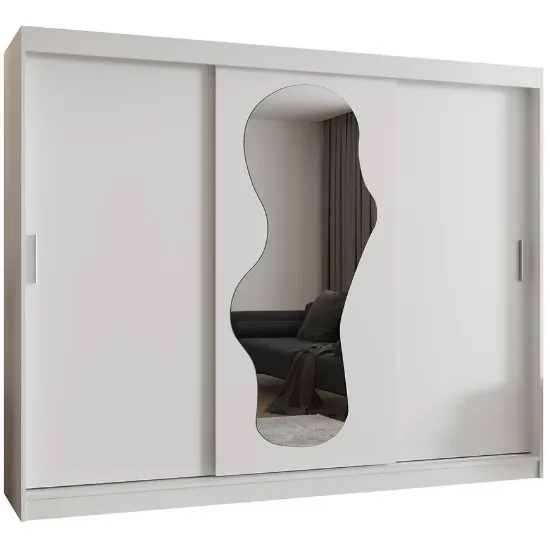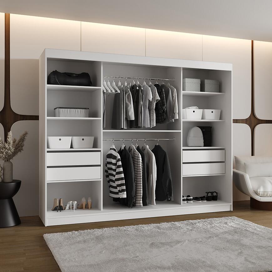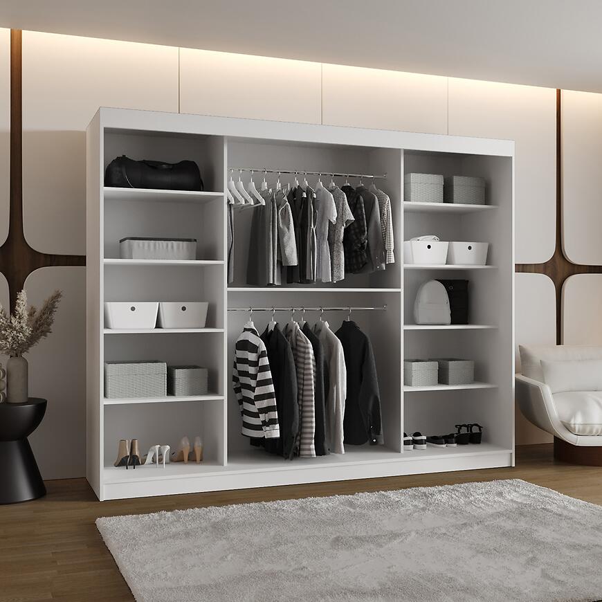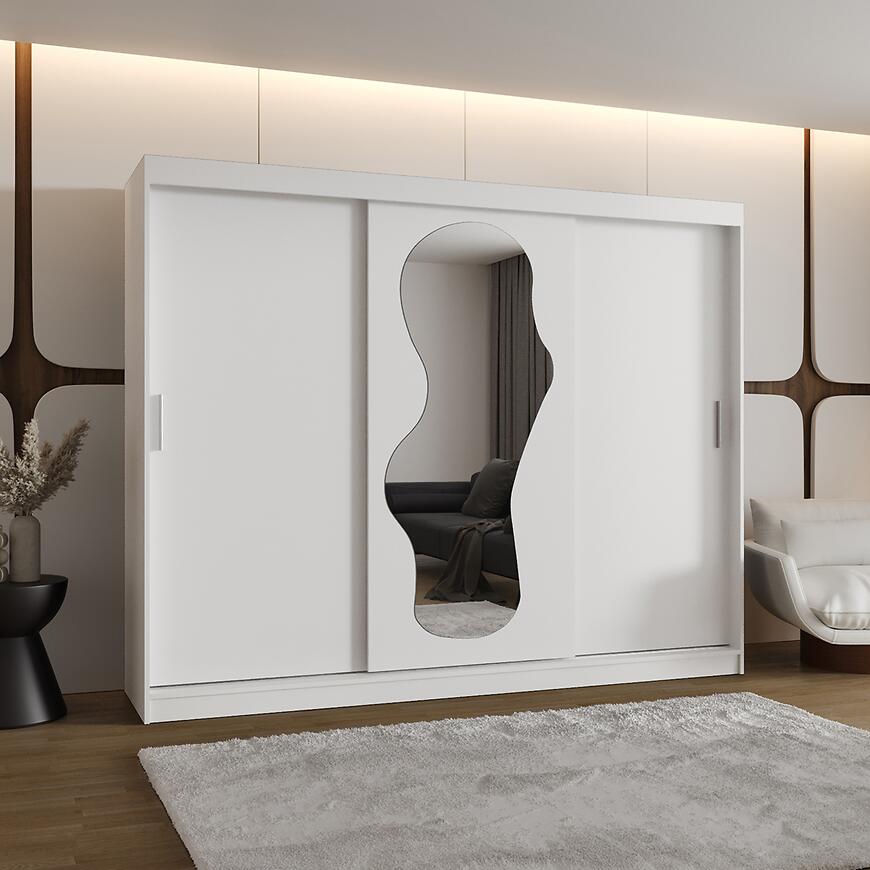 Szafa Ultra 250 w kolorze białym to elegancki i praktyczny mebel, idealny do nowoczesnych sypialni. Trzydrzwiowa konstrukcja z drzwiami przesuwnymi i wbudowanym lustrem pozwala wygodnie przechowywać ubrania, pościel oraz dodatki, jednocześnie optycznie powiększając przestrzeń wnętrza. Biały matowy front i korpus nadają meblowi subtelny i świeży wygląd, który pasuje do każdego stylu aranżacji.