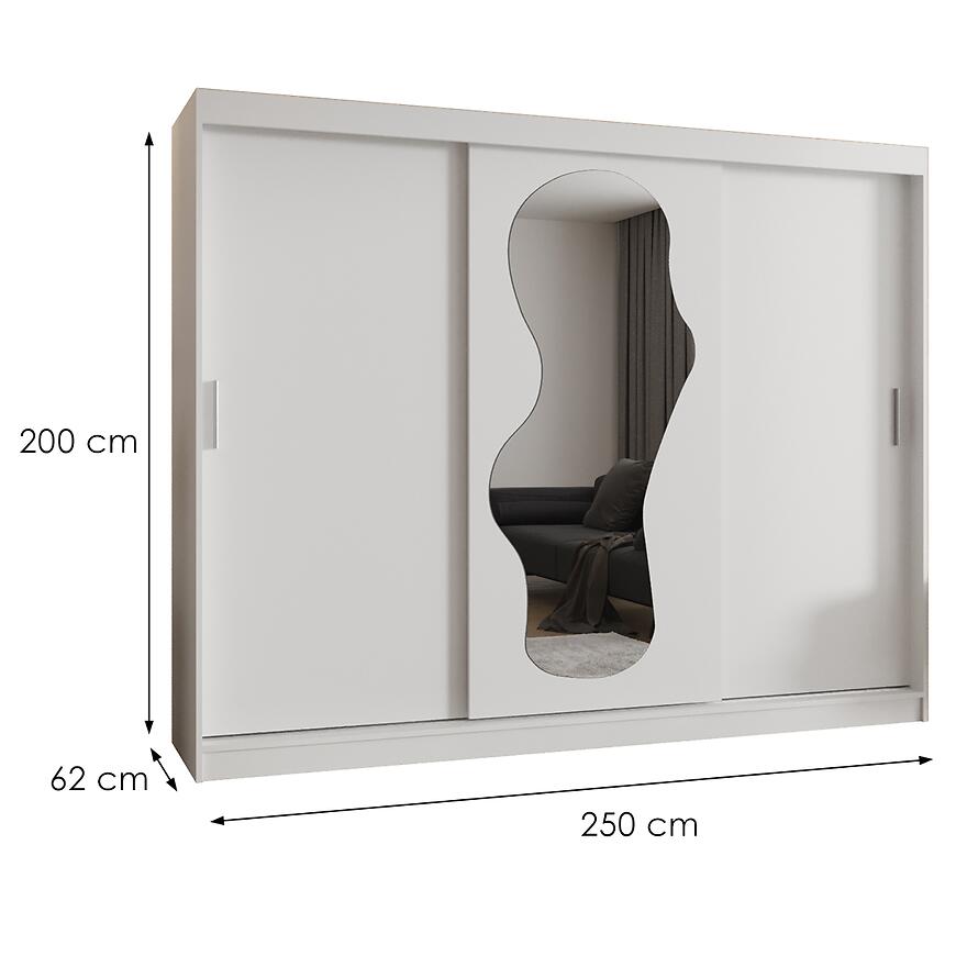 Szafa o wymiarach 200 cm wysokości, 250 cm szerokości i 62 cm głębokości zapewnia dużą przestrzeń do przechowywania, a przesuwne drzwi pozwalają na wygodny dostęp do zawartości nawet w mniejszych pomieszczeniach. Lustro na froncie nie tylko ułatwia codzienne przygotowania, ale też wizualnie powiększa wnętrze.