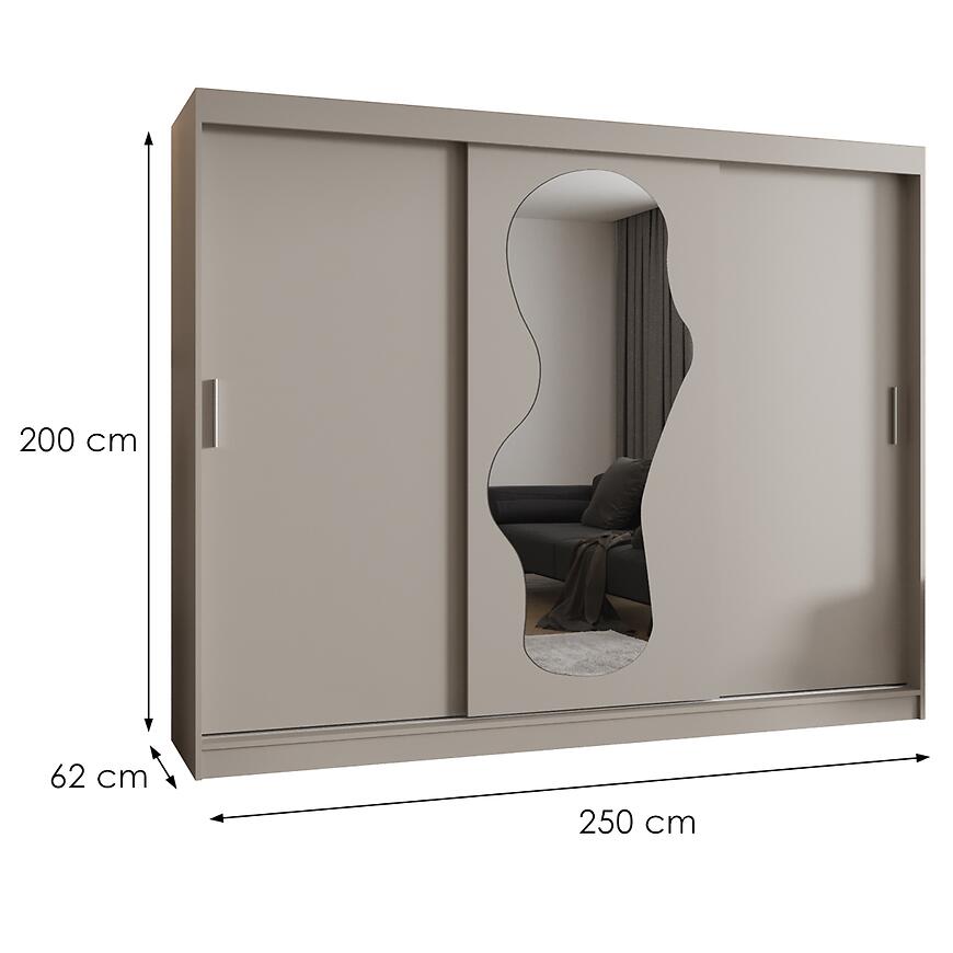 Dzięki wymiarom 200 cm wysokości, 250 cm szerokości i 62 cm głębokości szafa oferuje dużą przestrzeń do przechowywania, a przesuwne drzwi umożliwiają łatwy dostęp nawet w mniejszych pomieszczeniach. Lustro optycznie powiększa wnętrze i sprawia, że codzienne przygotowania stają się wygodniejsze.