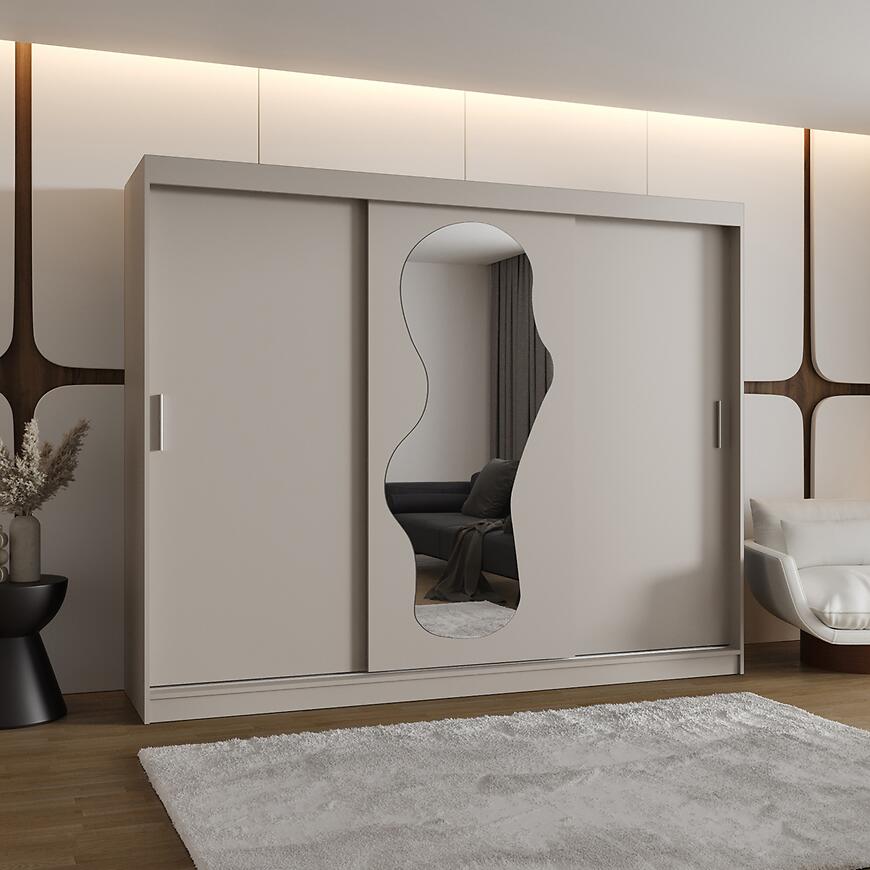 Szafa Ultra 250 w kolorze kaszmir to połączenie nowoczesnego designu i praktycznej funkcjonalności. Trzydrzwiowa konstrukcja z przesuwanymi drzwiami i wbudowanym lustrem pozwala na wygodne przechowywanie odzieży, pościeli i akcesoriów, jednocześnie dodając elegancji każdemu wnętrzu. Matowe, beżowe fronty i korpus tworzą subtelny, nowoczesny wygląd, który wpisuje się w minimalistyczne i stylowe aranżacje.
