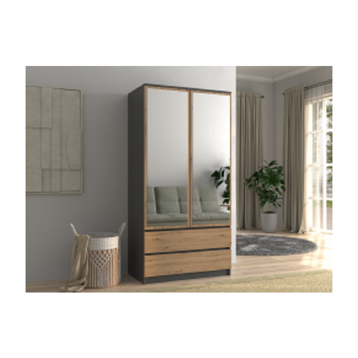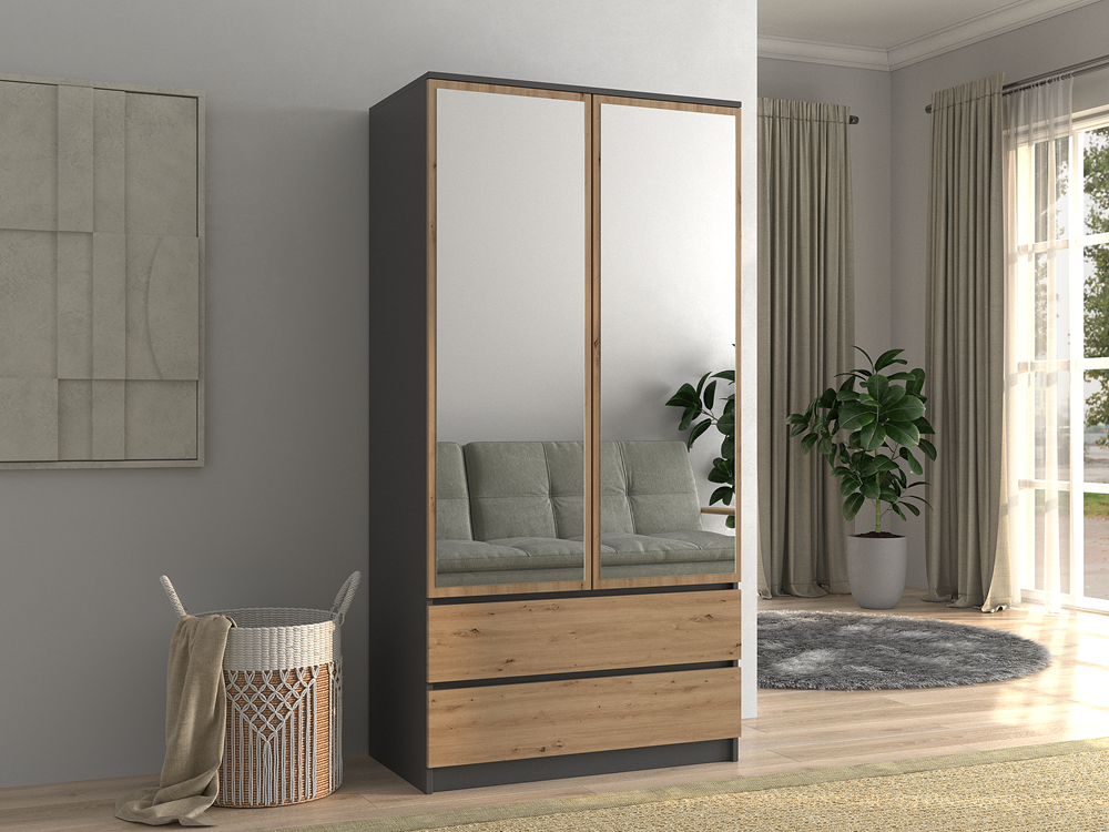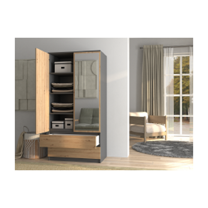 Szafa z drzwiami uchylnymi Umo z lustrem to doskonały wybór do garderoby, przedpokoju, salonu czy sypialni. Kolor frontów i korpusu sprawiają, że wpasuje się w większość aranżacji. Jej wnętrze jest pojemne i pomieści zarówno ubrania jak i inne akcesoria. Szafa jest 2-drzwiowa i posiada 2 szuflady.