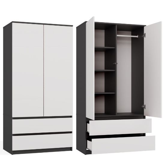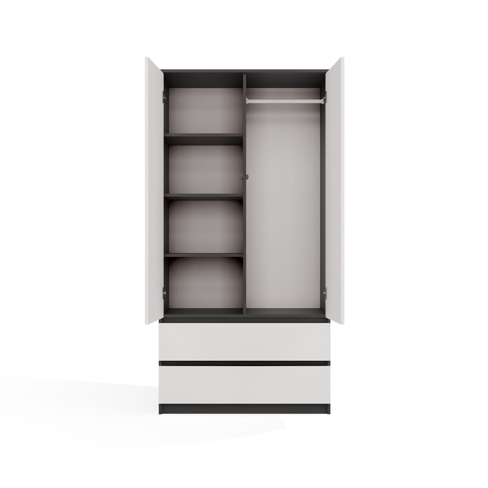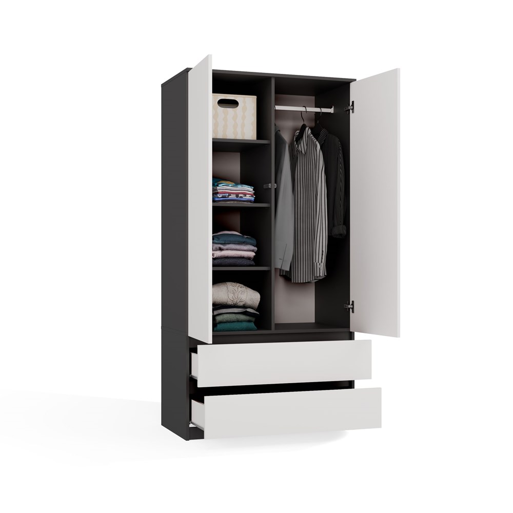 Połączenie dekoru antracyt z białymi frontami nadaje meblowi eleganckiego wyglądu, który wprowadza do wnętrza harmonię i ciepły klimat. Szafa Umo S2 to idealne połączenie nowoczesnego designu z funkcjonalnością, które pomoże w utrzymaniu porządku w każdej przestrzeni.