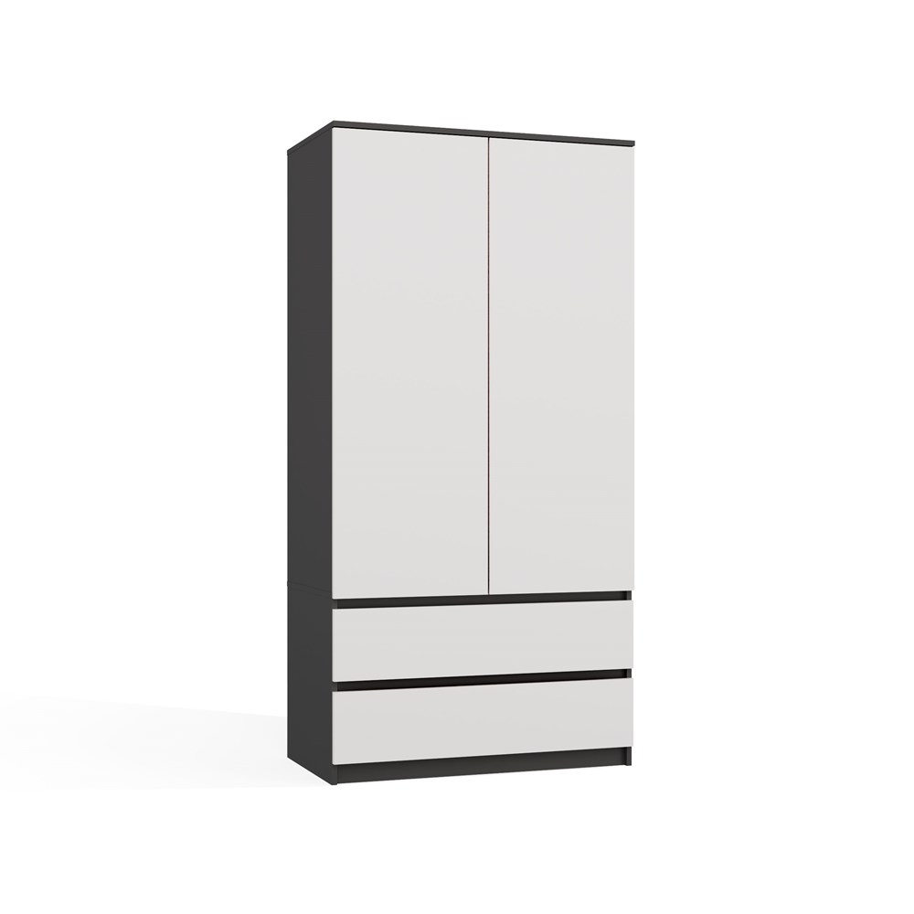 Szafa Umo S2 antracyt/biały to elegancki i funkcjonalny mebel, który doskonale wpasuje się w nowoczesne wnętrza sypialni, garderoby lub przedpokoju. Wykonana z wysokiej jakości laminowanej płyty wiórowej o grubości 16 mm, zapewnia trwałość i odporność na codzienne użytkowanie.