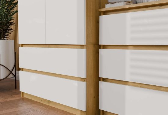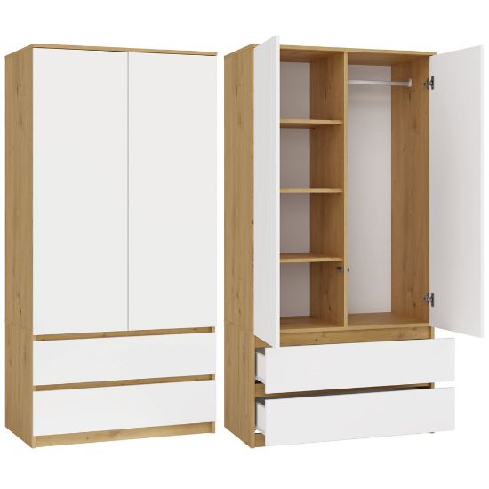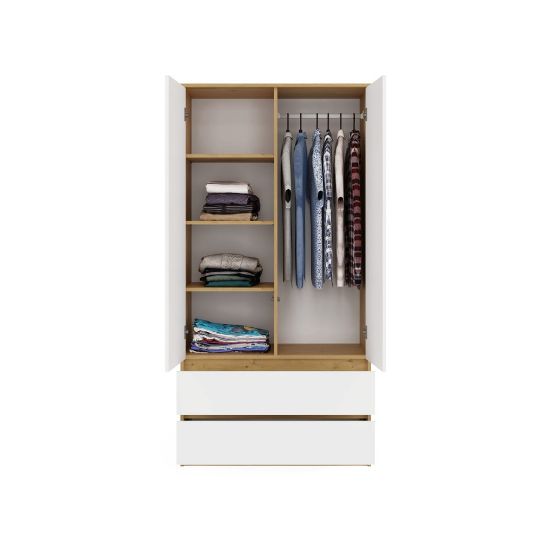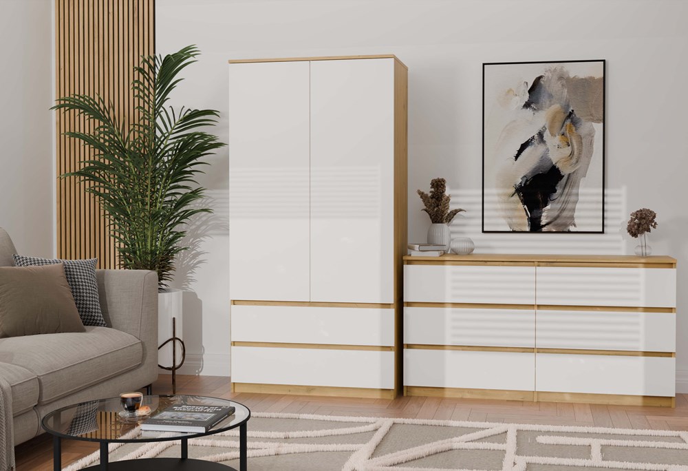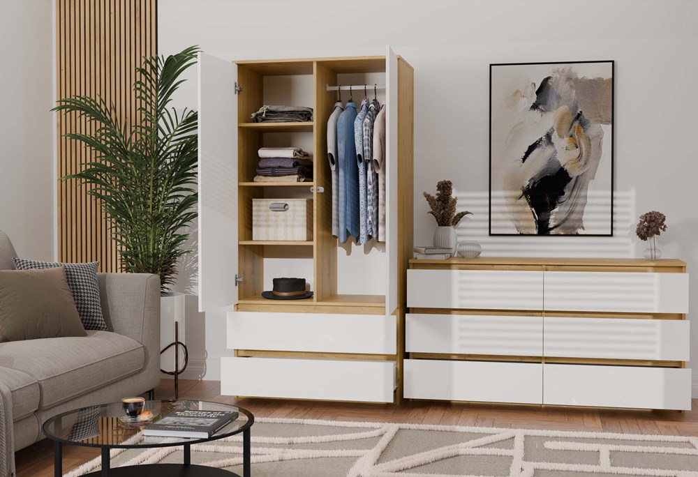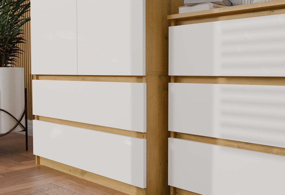 Połączenie dekoru dąb artisan z białymi frontami nadaje meblowi eleganckiego wyglądu, który wprowadza do wnętrza harmonię i ciepły klimat. Szafa Umo S2 to idealne połączenie nowoczesnego designu z funkcjonalnością, które pomoże w utrzymaniu porządku w każdej przestrzeni.