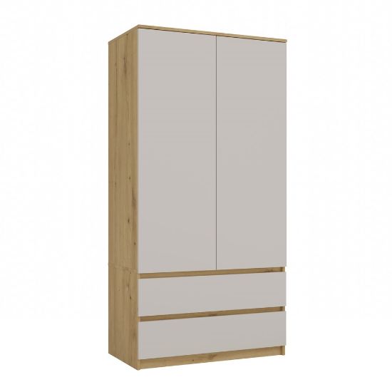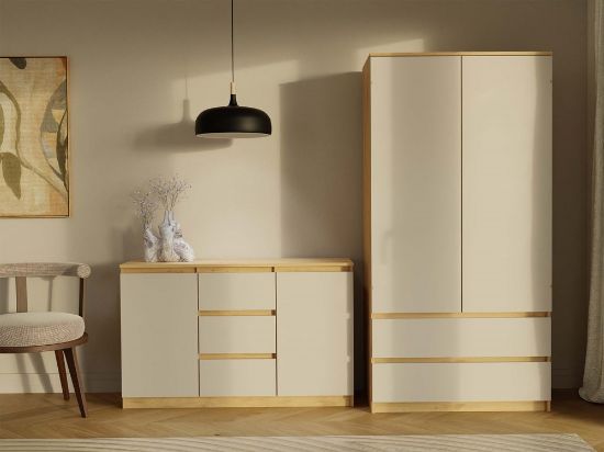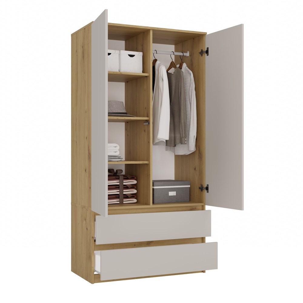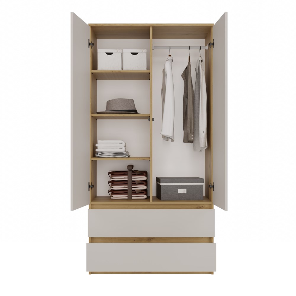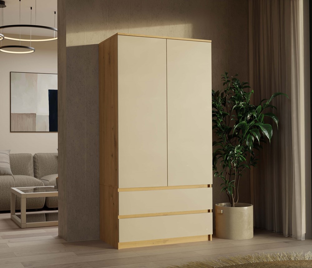 Połączenie dekoru dąb artisan z kaszmirowymi frontami nadaje meblowi eleganckiego wyglądu, który wprowadza do wnętrza harmonię i ciepły klimat. Szafa Umo S2 to idealne połączenie nowoczesnego designu z funkcjonalnością, które pomoże w utrzymaniu porządku w każdej przestrzeni.