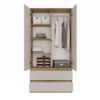 Przemyślany układ wnętrza obejmuje metalowy drążek na ubrania, który doskonale sprawdzi się na płaszcze, marynarki i koszule, a także półki idealne na złożone ubrania, dokumenty lub pudełka z akcesoriami. Dwie pojemne szuflady na prowadnicach rolkowych gwarantują płynne i bezpieczne wysuwanie, oferując dodatkową przestrzeń na bieliznę i drobiazgi. Bezuchwytowe fronty z systemem TIP-ON podkreślają minimalistyczny charakter szafy, umożliwiając wygodne otwieranie poprzez lekkie naciśnięcie.