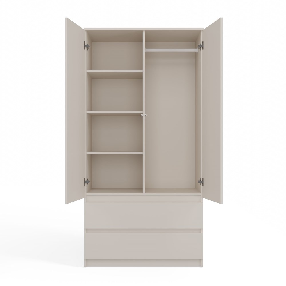 Szafa Umo S2 oferuje praktyczne rozwiązania w jednym meblu: miejsce do wieszania ubrań, cztery półki oraz dwie pojemne szuflady. Wykonana jest z wysokiej jakości płyty laminowanej, odpornej na zarysowania i wilgoć, co zapewnia długotrwałe użytkowanie. Wzmocnienia obrzeży wykonane z tworzywa ABS gwarantują estetykę i trwałość produktu.