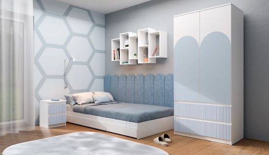 Szafa Umo S2 to idealny mebel do pokoju dziecka lub młodzieżowego, który łączy funkcjonalność z atrakcyjnym wyglądem. Wykonana w kolorze biały/niebieski, szafa posiada nadrukowane, pionowe wzory na szufladach oraz dodatkowy wzór na drzwiach, co nadaje jej wyjątkowy charakter.