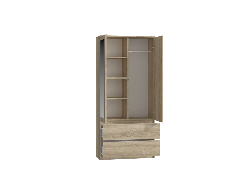 Szafa z drzwiami uchylnymi Umo to doskonały wybór do garderoby, przedpokoju, salonu czy sypialni. Kolor frontów i korpusu sprawiają, że wpasuje się w większość aranżacji. Jej wnętrze jest pojemne i pomieści zarówno ubrania jak i inne akcesoria. Szafa jest 2-drzwiowa i posiada 2 szuflady. Dodatkowym atutem jest lustro, które optycznie powiększy pomieszczenie.