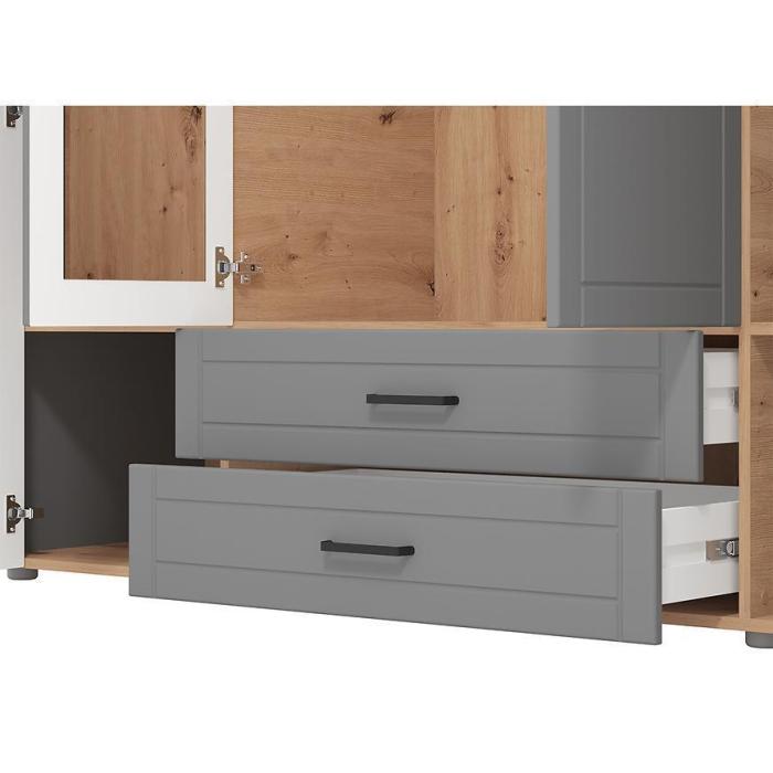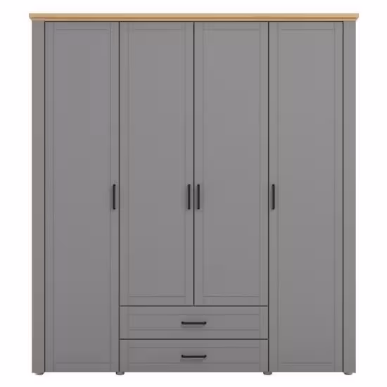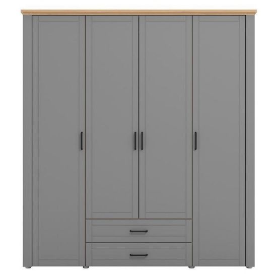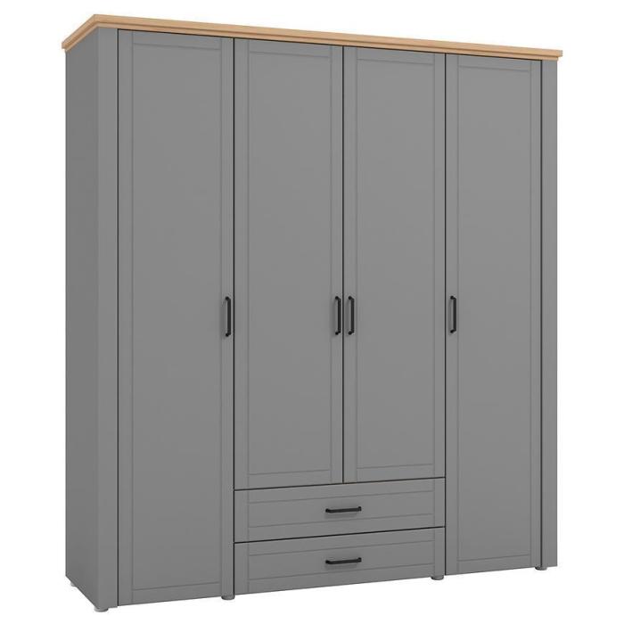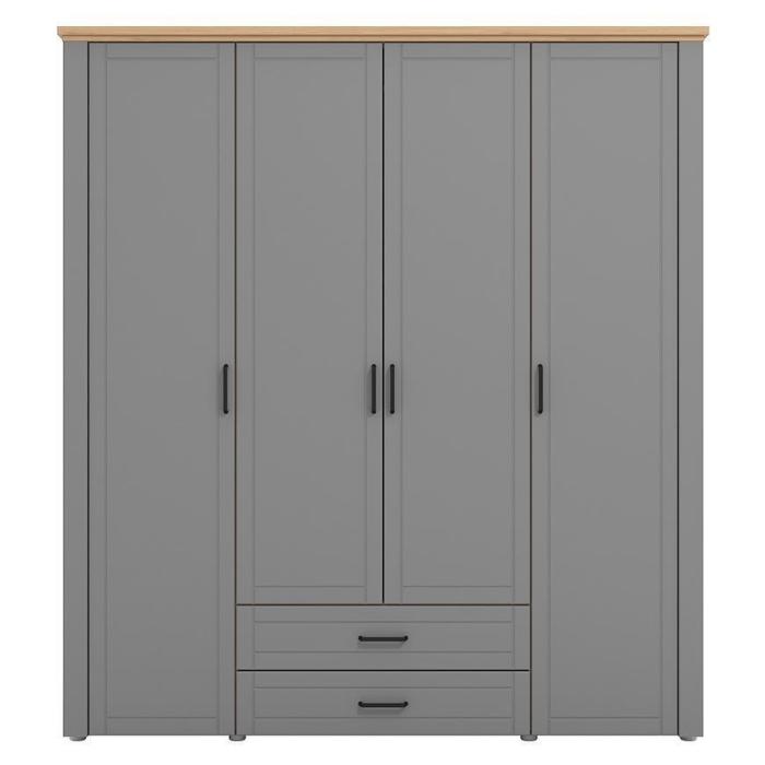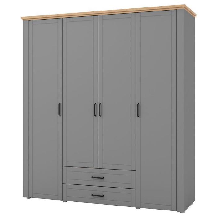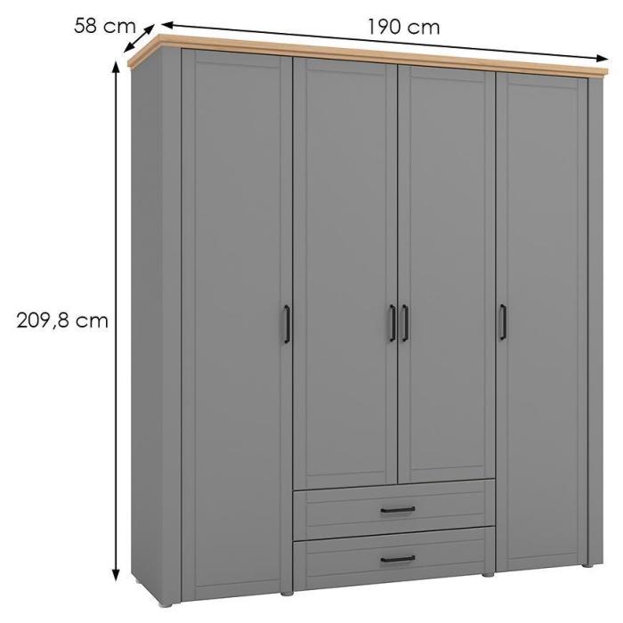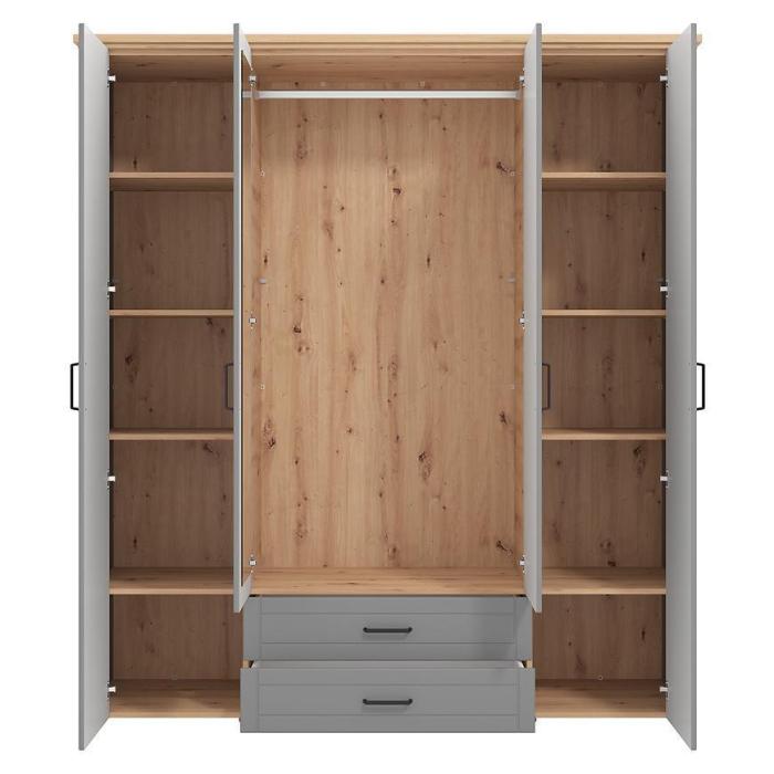Jej wnętrze podzielone jest na trzy części, w której znajduje się miejsce na drążek na długie ubrania oraz półki do przechowywania ubrań i rzeczy. Pojemna szafa jest wykonana z odpornej płyty laminowanej.