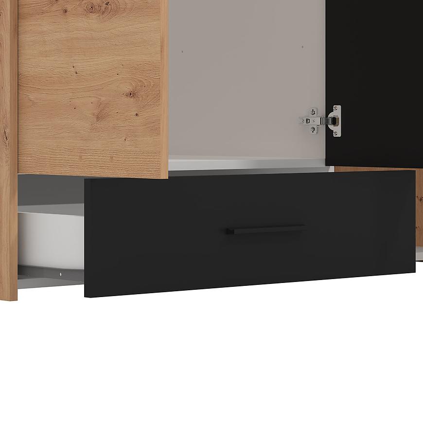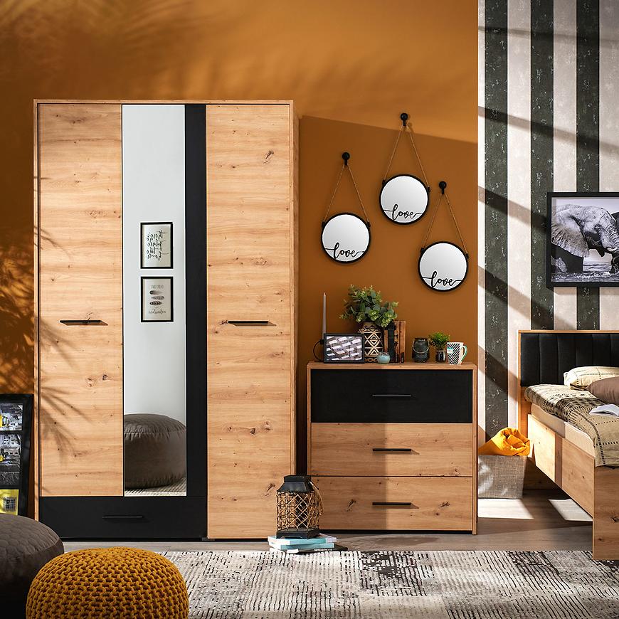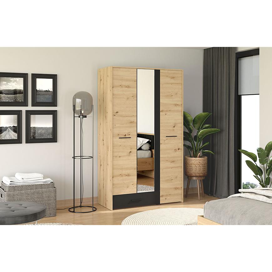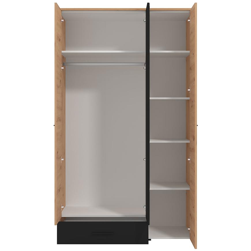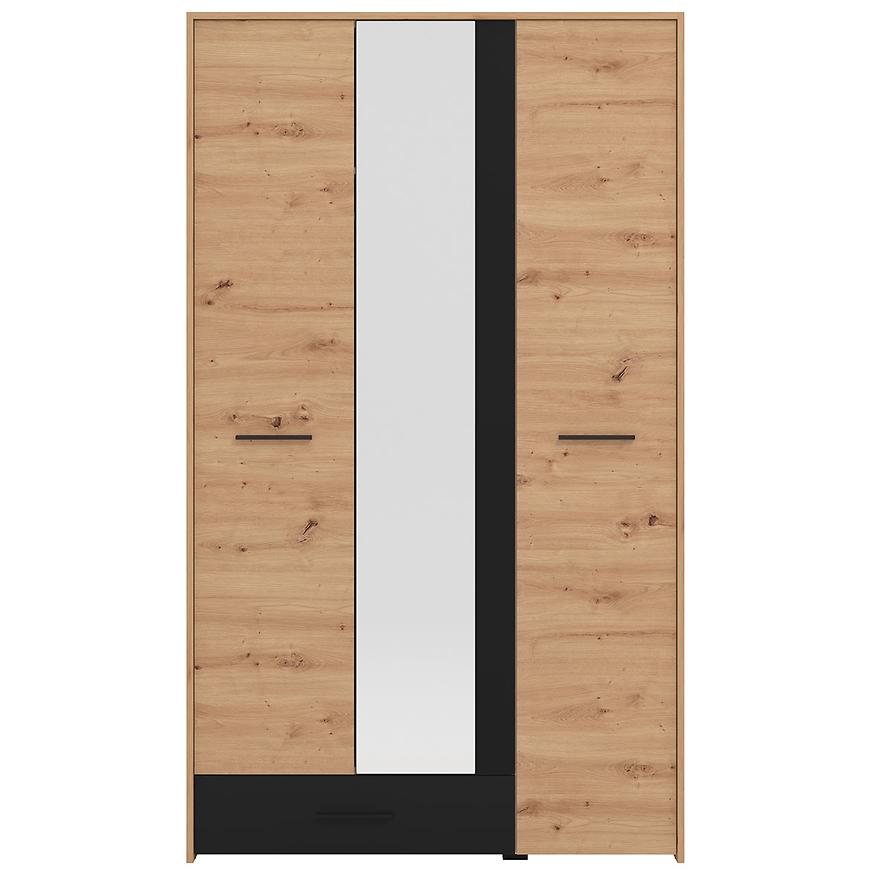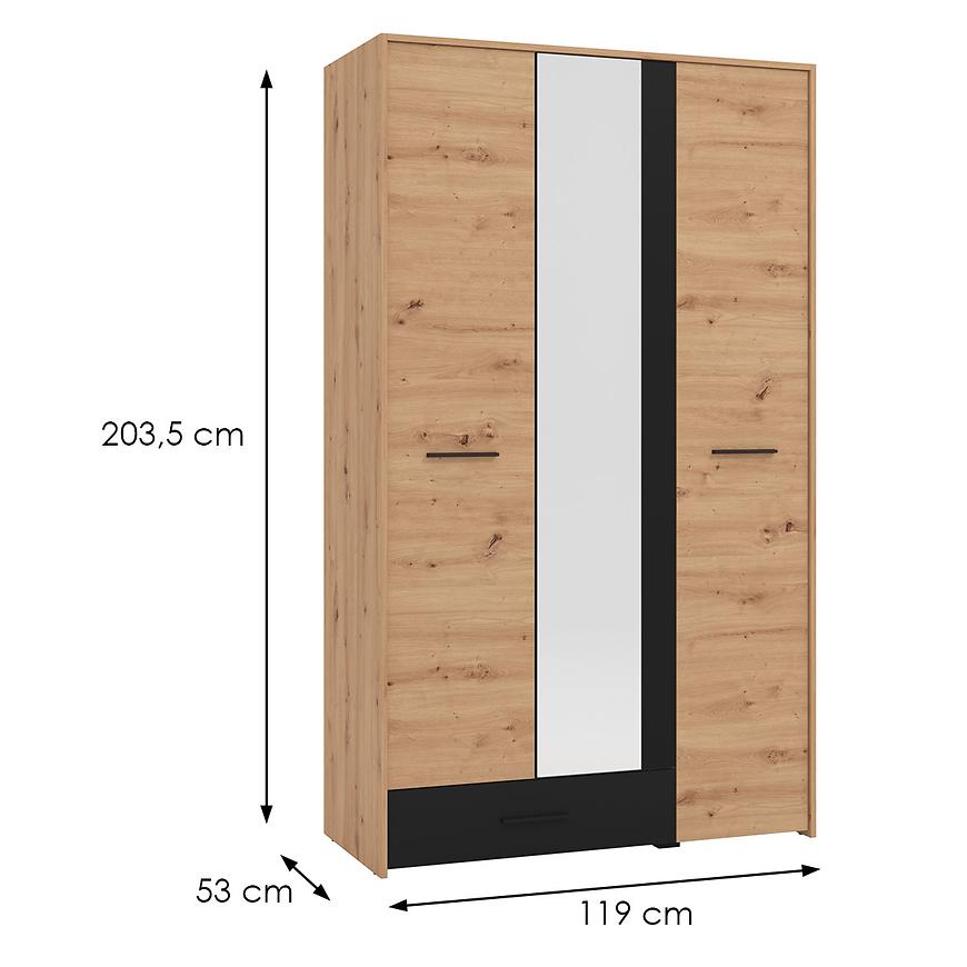Szafa ta charakteryzuje się trzema klasycznymi drzwiami, które nie tylko dodają jej uroku, ale także zapewniają dostęp do dużej ilości przestrzeni do przechowywania. Jedno z drzwi zostało wyposażone w lustro, co sprawia, że szafa nie tylko służy jako praktyczne miejsce do przechowywania ubrań, ale także jako funkcjonalne lustro, które ułatwia przygotowywanie się do wyjścia. Fronty szafy Varadero zostały wykonane z trwałej płyty wiórowej laminowanej o matowym wykończeniu. Korpus szafy, również wykonany z płyty wiórowej laminowanej w matowym wykończeniu, tworzy spójną całość z frontami. To mebel, który nie tylko pięknie się prezentuje, ale także jest trwały i łatwy w utrzymaniu w czystości.