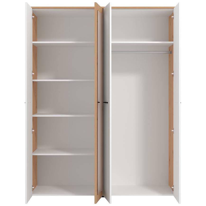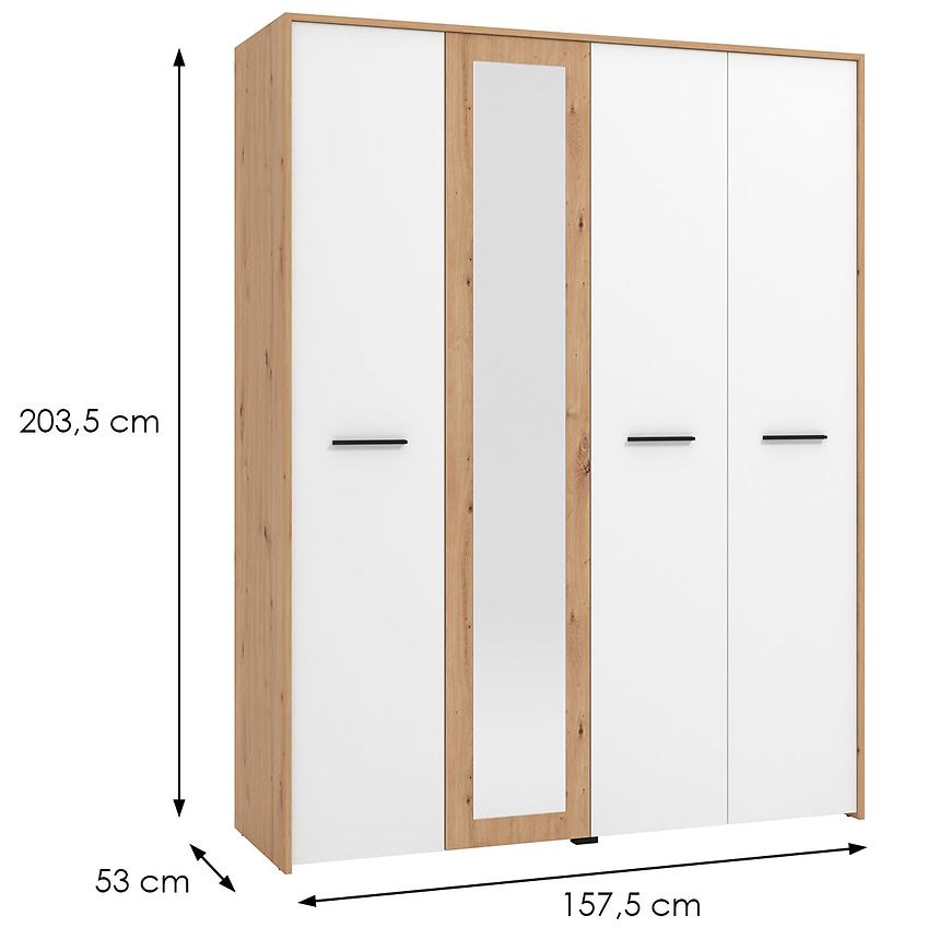 Szafa ta charakteryzuje się czterema klasycznymi drzwiami, które nie tylko dodają jej uroku, ale także zapewniają dostęp do dużej ilości przestrzeni do przechowywania. Jedno z drzwi zostało wyposażone w lustro, co sprawia, że szafa nie tylko służy jako praktyczne miejsce do przechowywania ubrań, ale także jako funkcjonalne lustro, które ułatwia przygotowywanie się do wyjścia. Fronty szafy Varadero zostały wykonane z trwałej płyty wiórowej laminowanej o matowym wykończeniu. Korpus szafy, również wykonany z płyty wiórowej laminowanej w matowym wykończeniu, tworzy spójną całość z frontami. To mebel, który nie tylko pięknie się prezentuje, ale także jest trwały i łatwy w utrzymaniu w czystości.