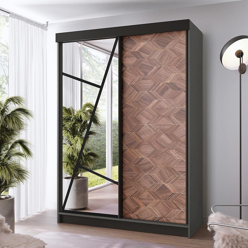 Szafa Vena 167 wyposażona jest w dwoje drzwi przesuwnych, co pozwala na wygodne i praktyczne korzystanie z przestrzeni przechowywania, nawet w mniejszych pomieszczeniach. Lustro umieszczone na jednym z frontów nie tylko pełni funkcję użytkową, ale także optycznie powiększa pomieszczenie, dodając mu głębi i jasności.
