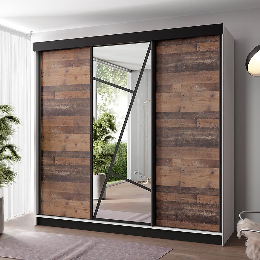 Jej prosty kształt doskonale wpasowuje się w nowoczesne aranżacje wnętrz, a trzydrzwiowe drzwi przesuwne zapewniają wygodny dostęp do wnętrza szafy bez konieczności otwierania drzwi na zewnątrz, co jest szczególnie przydatne w mniejszych pomieszczeniach.