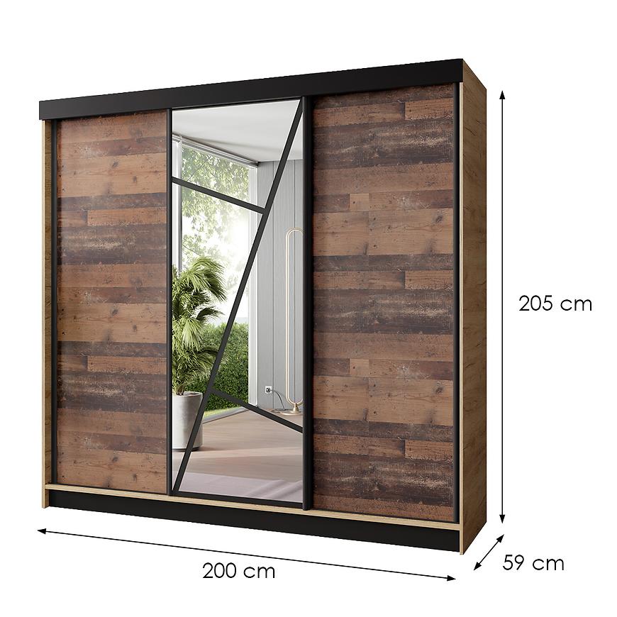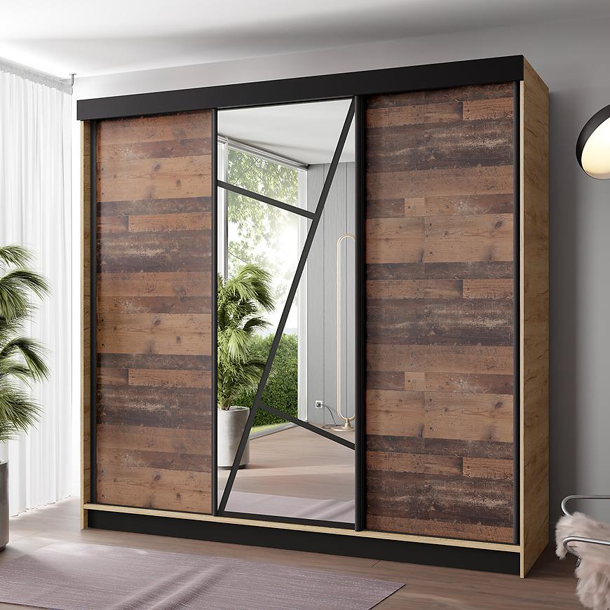 Szafa ma prosty, nowoczesny kształt, który idealnie komponuje się z różnymi aranżacjami wnętrz. Trzydrzwiowa konstrukcja z drzwiami przesuwnymi pozwala na łatwe i wygodne korzystanie z szafy, jednocześnie oszczędzając miejsce w pomieszczeniu. To rozwiązanie jest szczególnie praktyczne w mniejszych przestrzeniach, gdzie każdy centymetr jest na wagę złota.