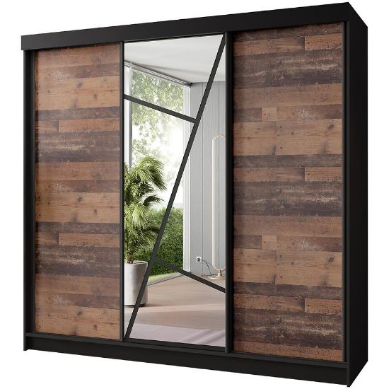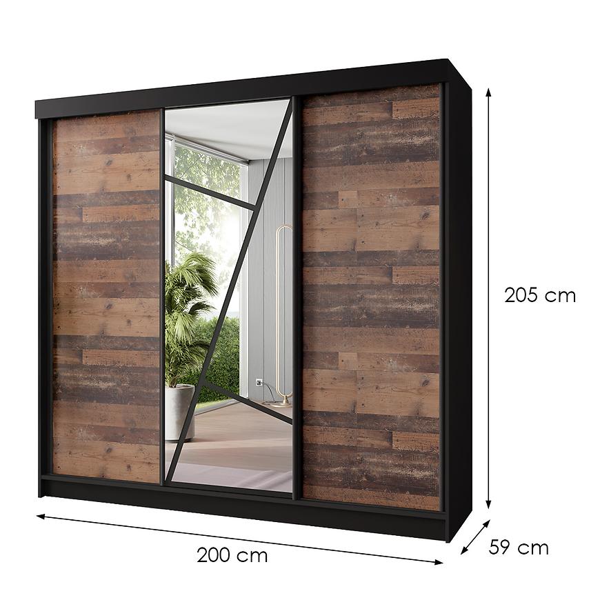 Jej prosta forma i trzydrzwiowy system z drzwiami przesuwnymi nie tylko oszczędzają miejsce w pomieszczeniu, ale również nadają szafie nowoczesny i elegancki wygląd. Drzwi pokryte są matową powierzchnią w kolorze "old style", co jest idealnym kompromisem pomiędzy klasycznym stylem a nowoczesnością. Kolor korpusu, utrzymany w matowej czerni, doskonale kontrastuje z drewnopodobnym wybarwieniem frontów, nadając szafie wyjątkowego charakteru.