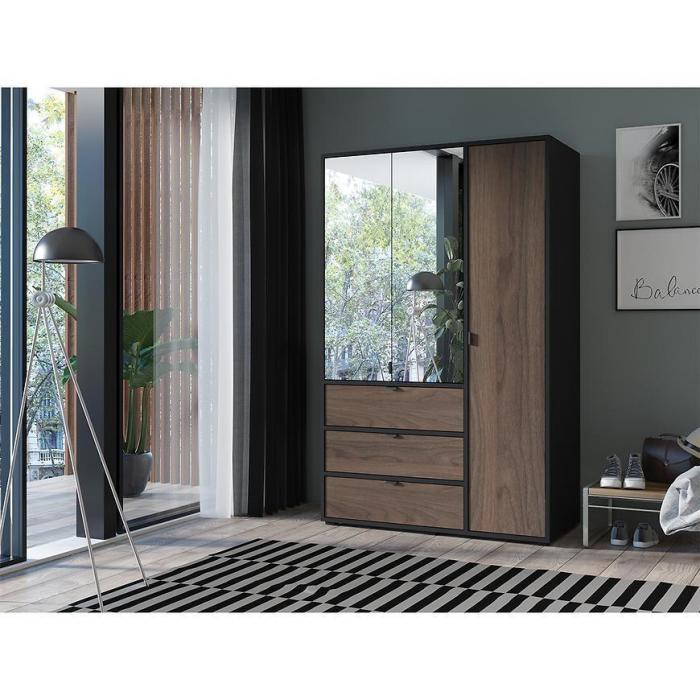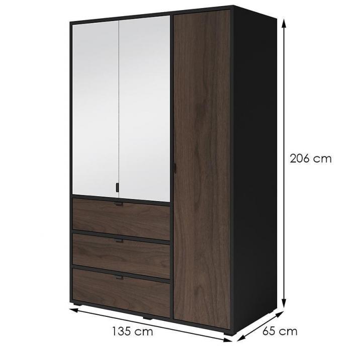 Szafa uchylna w kolorze orzech/czarny to propozycja do pokoju dziennego, ale znajdzie swoje miejsce również w innym pomieszczeniu, jak na przykład - przedpokój czy garderobie. Materiał wykonania to płyta wiórowa laminowana. Szafa posiada również lustro, które sprawi, że pomieszczenie stanie się optycznie większe. Nowoczesny styl mebli wpadnie do gustu każdemu, kto poszukuje eleganckiego, klasycznego, a zarazem nowoczesnego umeblowania. Idealnie wpasuje się w większość aranżacji. Przeznaczona do samodzielnego montażu.