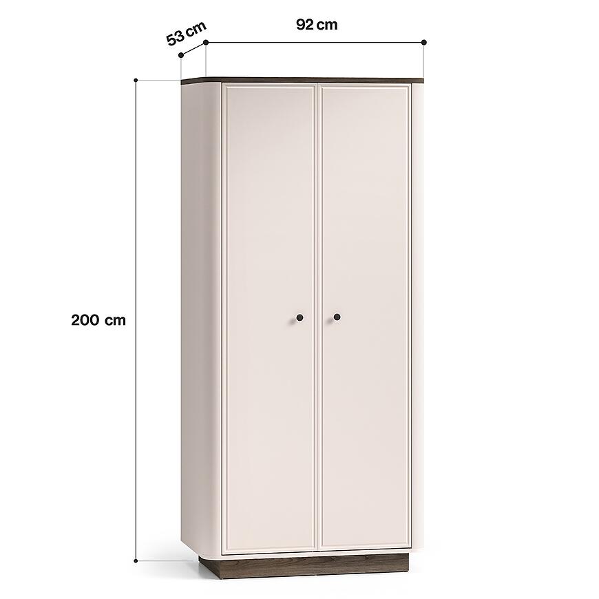 Model o wymiarach 92x200x53 cm oferuje wygodną przestrzeń do przechowywania odzieży i tekstyliów. Dwudrzwiowa konstrukcja zapewnia łatwy dostęp do wnętrza, a brak lustra pozwala zachować minimalistyczny i spójny wygląd frontu. Szafa świetnie sprawdzi się zarówno w mniejszych, jak i większych pomieszczeniach.