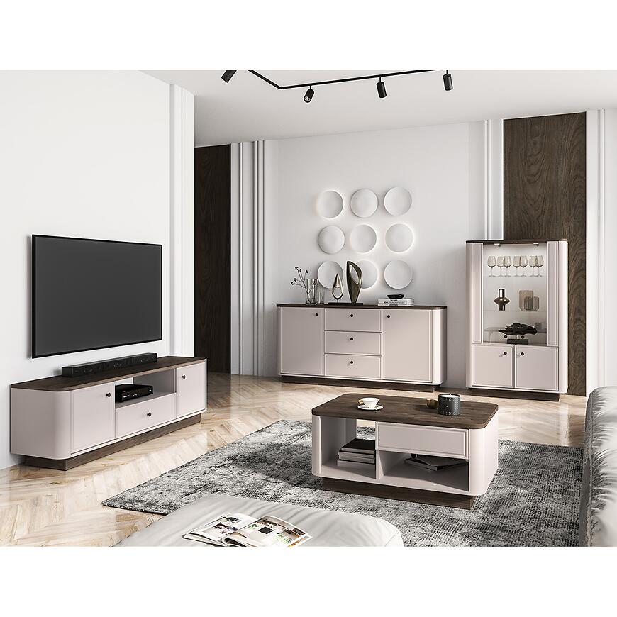 Fronty wykonane z płyty MDF oraz korpus z płyty wiórowej laminowanej gwarantują trwałość i stabilność konstrukcji. Matowe wykończenie podkreśla elegancki styl mebla i ułatwia utrzymanie go w czystości, co ma znaczenie w codziennym użytkowaniu.