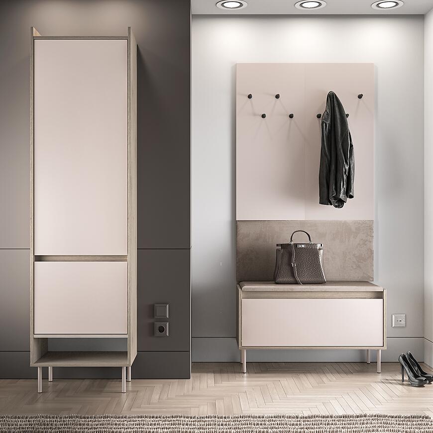 Dwudrzwiowa konstrukcja szafy charakteryzuje się prostym kształtem i klasycznymi drzwiami, co podkreśla elegancki charakter mebla. Fronty w odcieniu cashmere harmonijnie kontrastują z korpusem w jasnym dębie cremona, tworząc spójną i estetyczną całość. Matowe wykończenie nadaje szafie subtelnego, nowoczesnego akcentu.