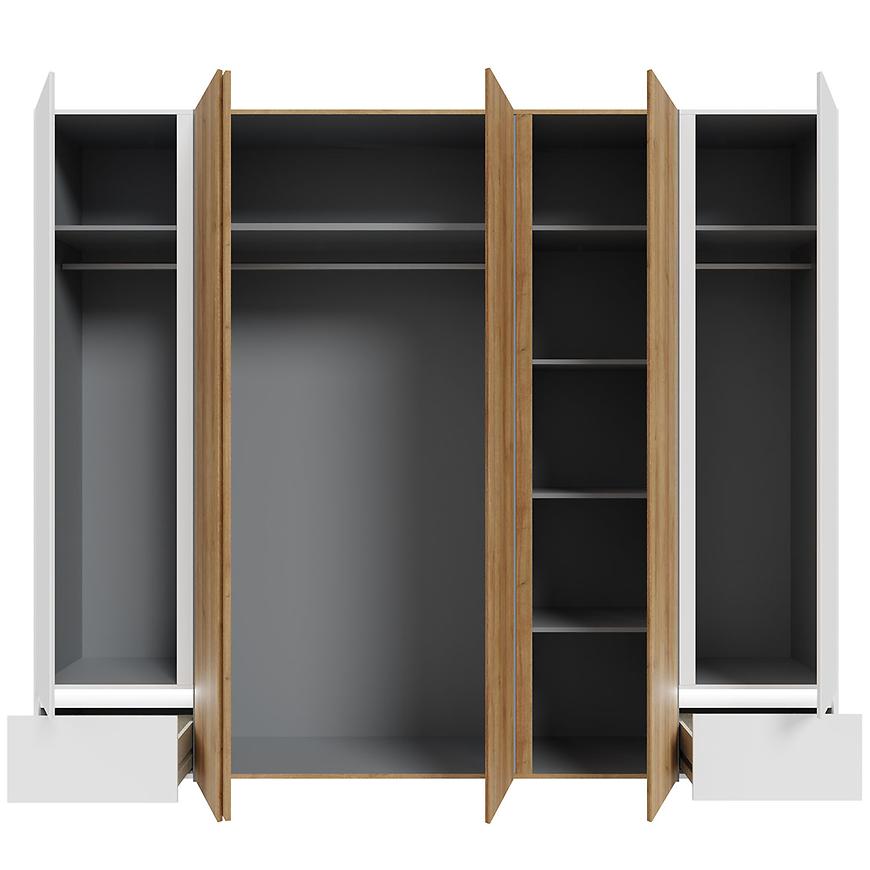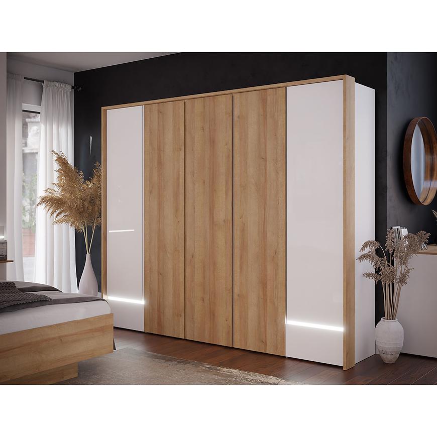 Szafa Whiteheaven wyróżnia się dwoma wariantami kolorów frontów - białym i dębem riviera. To eleganckie połączenie kontrastujących tonów, które nadaje meblowi wyjątkowego charakteru. Niezależnie od tego, czy preferujesz jasne, czy ciemniejsze odcienie, ta szafa jest idealnym wyborem. Wyposażona jest w klasyczne drzwi, które dodają jej uroku i klasy. To rozwiązanie sprawia, że mebel jest idealnym dodatkiem zarówno do nowoczesnych, jak i klasycznych wnętrz. Zarówno fronty, jak i korpus szafy Whiteheaven wykonane są z płyty wiórowej laminowanej, co gwarantuje wysoką jakość oraz trwałość mebla. Szafa wyposażona jest w oświetlenie, które dodaje jej elegancji i funkcjonalności. Dzięki oświetleniu Twoje przedmioty zostaną pięknie podświetlone, co dodatkowo podkreśli ich wartość.