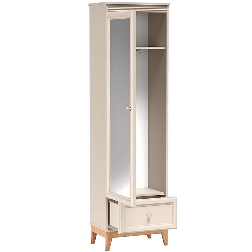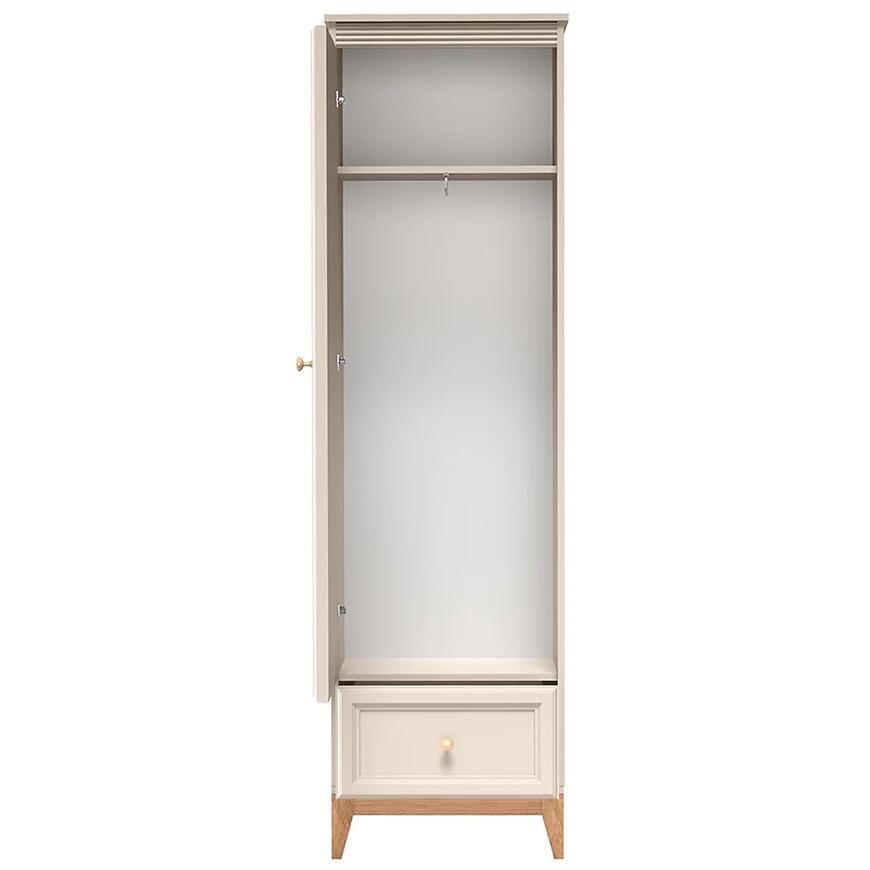 Szafa Windsor W-18 w kolorze kashmir z dodatkiem dębu naturalnego to kompaktowy i funkcjonalny mebel o nowoczesnym, skandynawskim charakterze. Jednodrzwiowa konstrukcja z wbudowanym lustrem zapewnia praktyczne rozwiązanie do przechowywania ubrań i akcesoriów, a matowe wykończenie frontów nadaje meblowi elegancki, ponadczasowy wygląd.