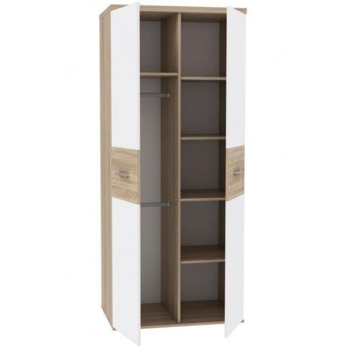 Szafa z drzwiami uchylnymi Winnie to doskonały wybór do garderoby, przedpokoju czy sypialni. Fronty i korpus w kolorze białym i dąb sonoma sprawiają, że wpasuje się w większość aranżacji. Jej wnętrze jest pojemne i pomieści zarówno ubrania jak i inne akcesoria. Szafa jest dwudrzwiowa.