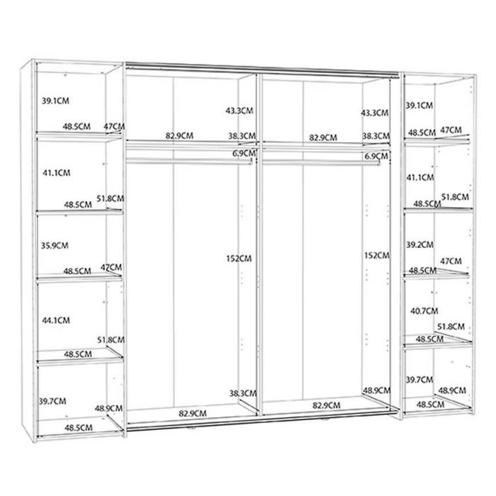 Do szafy można dokupić dodatkowe wyposażenie: półki, komodę wewnętrzną oraz hamulec do drzwi.