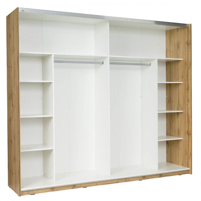Wygląd szafy Wood zachwyci każdego - kolor mebla w postaci połączenia białych frontów w połysku z drewnopodobnym dekorem tworzy idealną całość. Jest to niezbędny element wyposażenia każdego domu. Szafa posiada wystarczającą ilość miejsca zarówno do wieszania ubrań jak i na inne przedmioty.