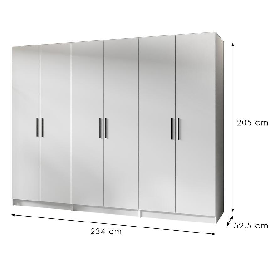 Szafa X3 Gold 2d w kolorze Biały/Biały to nowoczesny mebel z kolekcji GOLD o wymiarach 234 cm szerokości, 205 cm wysokości i 52,5 cm głębokości. Posiada klasyczne, kilkudrzwiowe fronty bez lustra, wykonane z laminowanej płyty wiórowej z matowym wykończeniem, podobnie jak korpus. Szafa waży 171 kg, nie posiada oświetlenia i wymaga samodzielnego montażu. Idealnie sprawdzi się w nowoczesnych wnętrzach, zapewniając dużą przestrzeń do przechowywania.