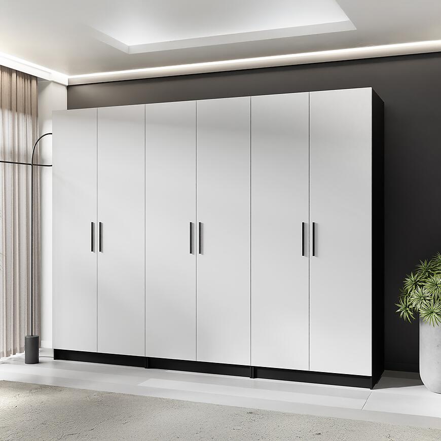 Szafa X3 Gold 2d w kolorze Czarny/Biały to nowoczesna, pojemna szafa o prostym kształcie. Jej wymiary to 234 cm szerokości, 205 cm wysokości i 52,5 cm głębokości. Szafa posiada klasyczne, kilkudrzwiowe drzwi, wykonane z laminowanej płyty wiórowej z matowym wykończeniem, podobnie jak korpus w kolorze czarnym. Model nie posiada lustra ani opcji oświetlenia, waży 171 kg i wymaga samodzielnego montażu. Należy do kolekcji GOLD.