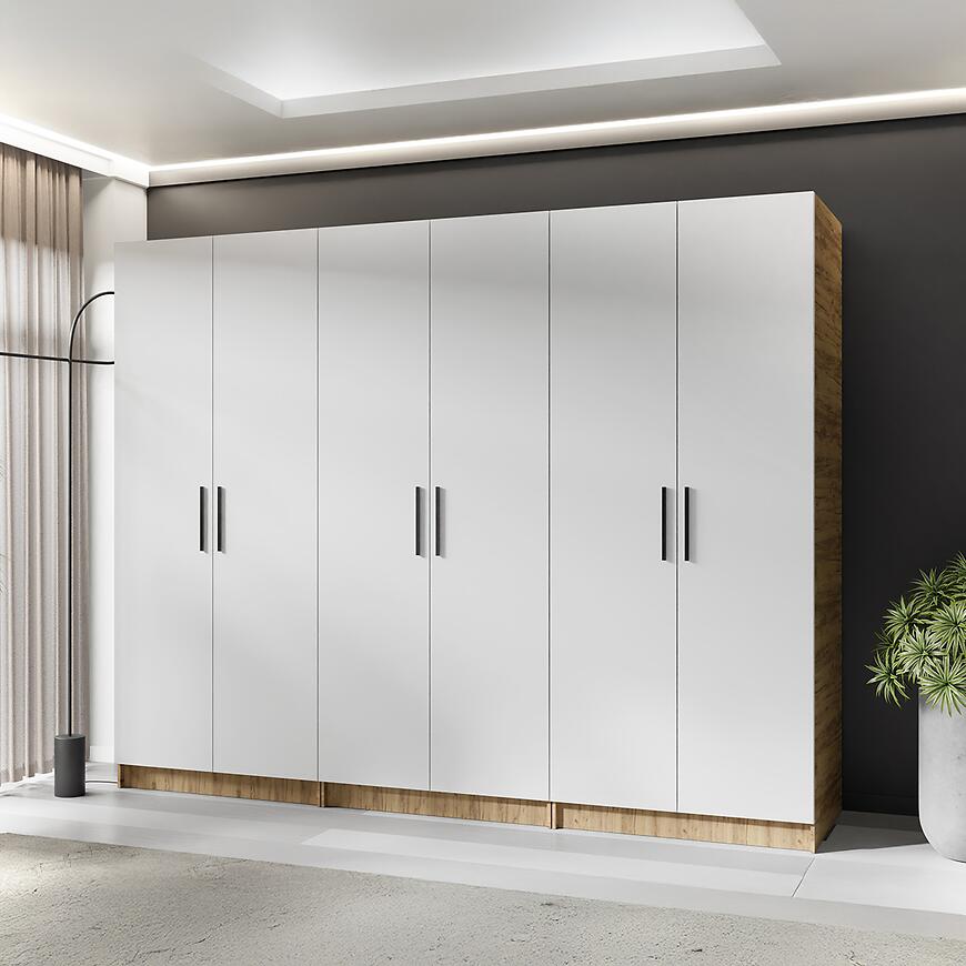 Szafa X3 Gold 2d w kolorze Dąb Craft Złoty/Biały to nowoczesna i funkcjonalna szafa o prostym, eleganckim designie. Jej wymiary to 234 cm szerokości, 205 cm wysokości i 52,5 cm głębokości. Fronty wykonano z laminowanej płyty wiórowej w białym, matowym wykończeniu, natomiast korpus jest w kolorze dąb craft złoty, również z matowym wykończeniem. Szafa posiada klasyczne kilkudrzwiowe drzwi, nie zawiera lustra ani opcji oświetlenia. Mebel waży 171 kg i wymaga samodzielnego montażu. Należy do kolekcji GOLD.