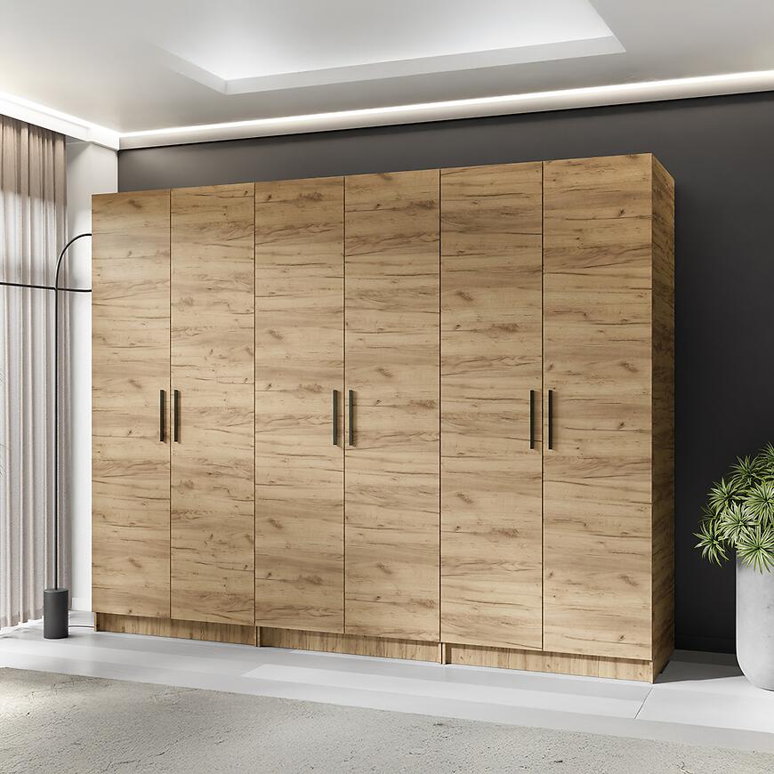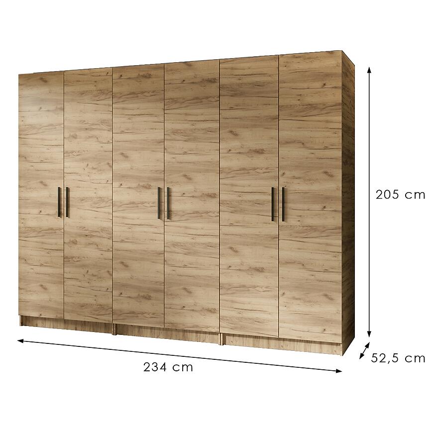 Szafa X3 Gold 2d w kolorze Dąb Craft Złoty/Dąb Craft Złoty to przestronna i nowoczesna szafa o prostym, eleganckim designie. Jej wymiary to 234 cm szerokości, 205 cm wysokości i 52,5 cm głębokości. Zarówno fronty, jak i korpus wykonano z laminowanej płyty wiórowej w jasnym, drewnopodobnym wykończeniu matowym. Szafa posiada klasyczne kilkudrzwiowe drzwi, nie zawiera lustra ani opcji oświetlenia. Mebel waży 171 kg i wymaga samodzielnego montażu. Należy do kolekcji GOLD.