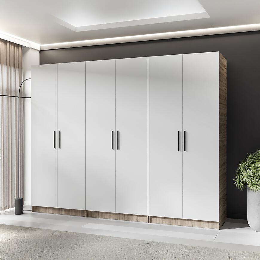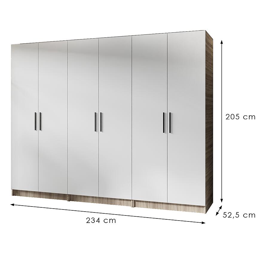 Szafa X3 Gold 2d w kolorze Dąb Sonoma/Biały to nowoczesna i przestronna szafa o prostym kształcie. Jej wymiary wynoszą 234 cm szerokości, 205 cm wysokości i 52,5 cm głębokości. Fronty wykonano z laminowanej płyty wiórowej w białym, matowym wykończeniu, natomiast korpus jest w kolorze dąb sonoma. Szafa posiada klasyczne kilkudrzwiowe drzwi, nie zawiera lustra ani opcji oświetlenia. Mebel waży 171 kg i wymaga samodzielnego montażu. Należy do kolekcji GOLD.