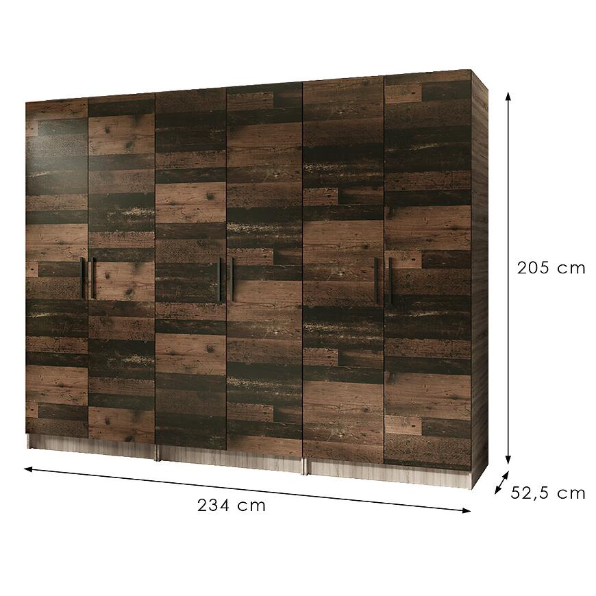 Szafa X3 Gold 2d w kolorze Dąb Sonoma/Old Style to nowoczesna i funkcjonalna szafa o prostym kształcie. Jej wymiary wynoszą 234 cm szerokości, 205 cm wysokości i 52,5 cm głębokości. Fronty wykonano z laminowanej płyty wiórowej w odcieniu Old Style, natomiast korpus jest w kolorze dąb sonoma – oba elementy mają matowe wykończenie. Szafa wyposażona jest w klasyczne kilkudrzwiowe drzwi, nie posiada lustra ani oświetlenia. Mebel waży 171 kg, wymaga samodzielnego montażu i należy do kolekcji GOLD.