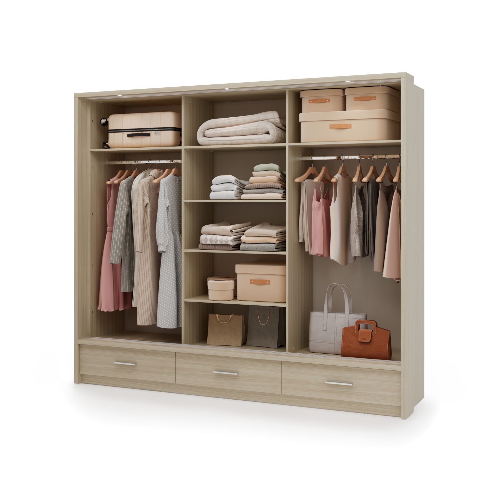 Szafa trzydrzwiowa o szerokości 250 cm z drzwiami przesuwnymi to rozwiązanie dla osób, które potrzebują dużej, dobrze zorganizowanej przestrzeni do przechowywania ubrań, tekstyliów i akcesoriów. Konstrukcja oparta na korpusie i frontach z płyty laminowanej zapewnia stabilność oraz odporność na codzienne użytkowanie – powierzchnia jest łatwa w czyszczeniu i mniej podatna na zarysowania niż tradycyjne okleiny papierowe.