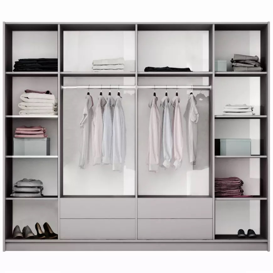 Czterodrzwiowa konstrukcja szafy zapewnia dużą pojemność i ułatwia organizację przechowywanych rzeczy. Drzwi składano-przesuwne to rozwiązanie idealne, gdy przestrzeń wokół szafy jest ograniczona, umożliwiając wygodne otwieranie i zamykanie nawet w mniejszych pomieszczeniach.
