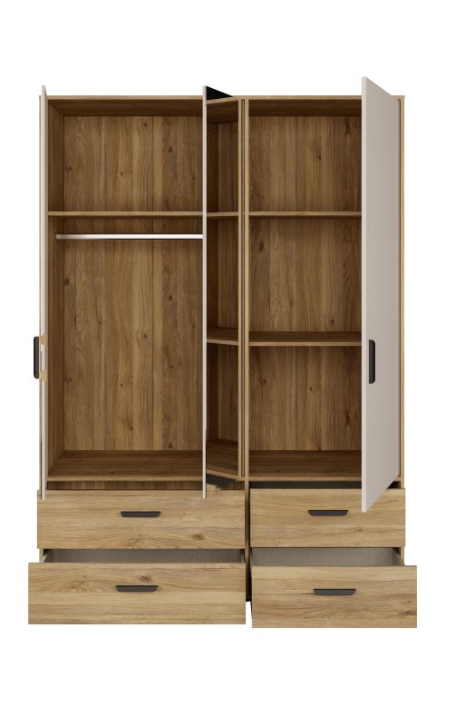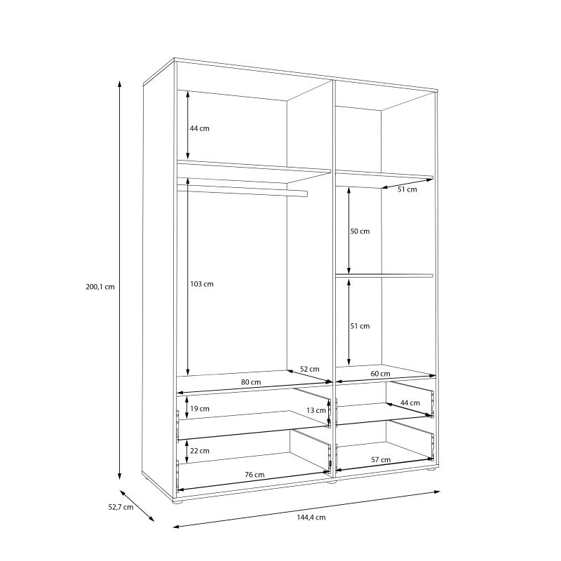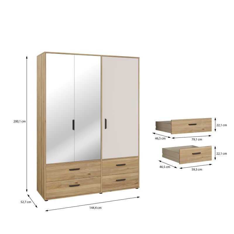 Dzięki tym wymiarom szafa jest pojemna, ale nie przytłacza przestrzeni, przez co sprawdzi się nawet w średniej wielkości sypialniach i garderobach.