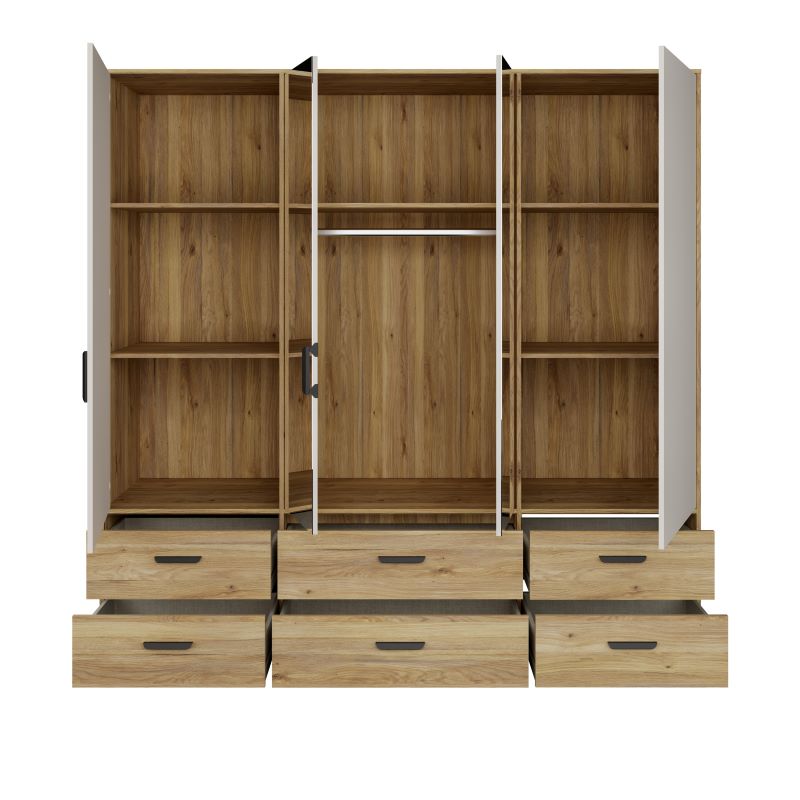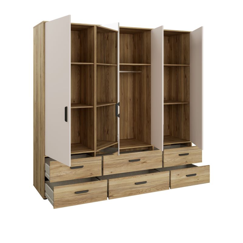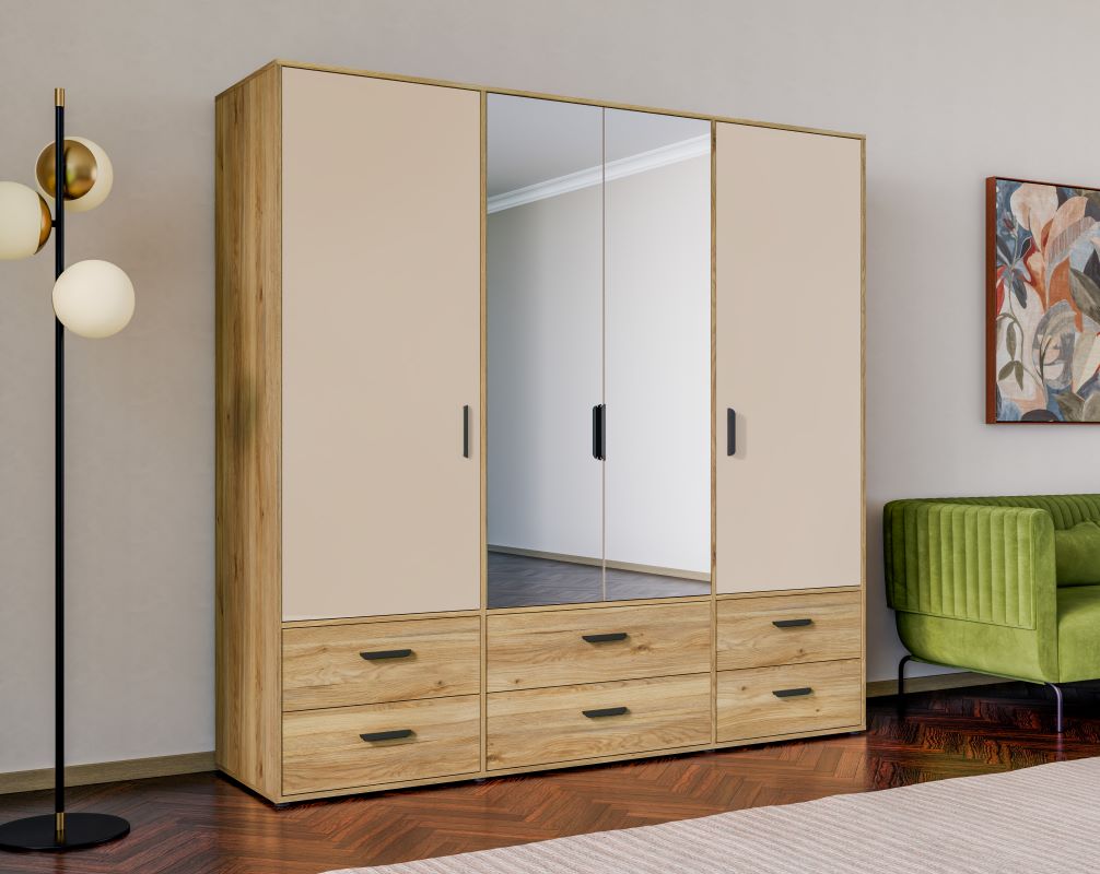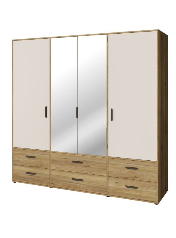 Szafa 4-drzwiowa Calvado MOKS846 została zaprojektowana tak, aby łączyć funkcjonalność z estetyką. Dzięki dużej ilości szuflad i półek pozwala na przechowywanie nawet bardzo rozbudowanej garderoby. Centralne lustro zwiększa praktyczność mebla i jednocześnie pełni rolę dekoracyjną, dodając wnętrzu lekkości.
