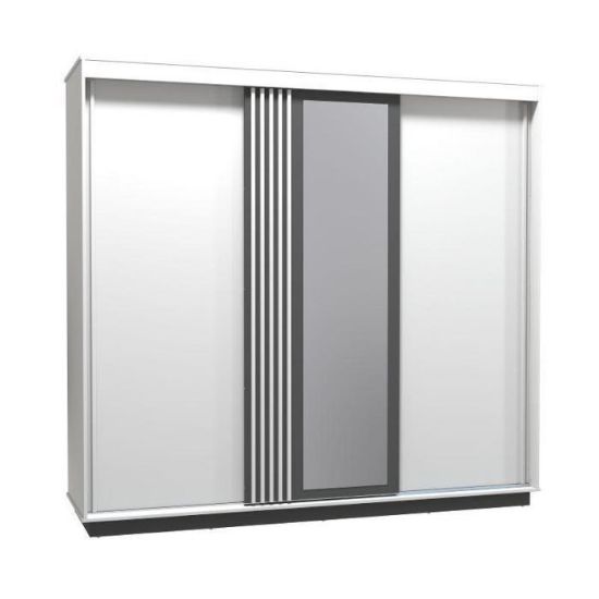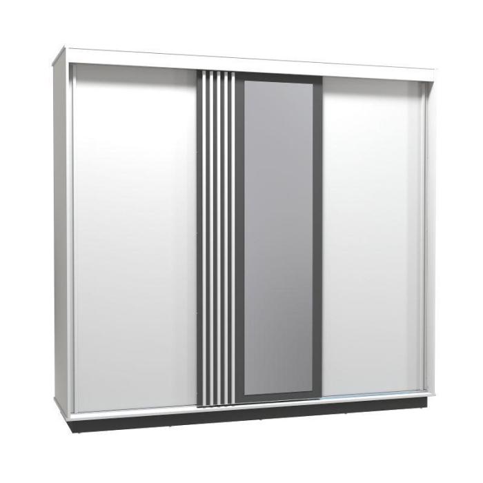 Szafa trzydrzwiowa Larisa to doskonała propozycja do sypialni, a także do przedpokoju. Korpus oraz fronty szafy wykonane są w dekorze biel arktyczna. Całość w matowym wykończeniu. Szafa posiada drzwi przesuwne, na froncie zamontowano pojedyncze lustro. Ozdobne lamele w kolorze białym wykonane zostały z płyty MDF (zamontowane na kontrastowym grafitowym tle).