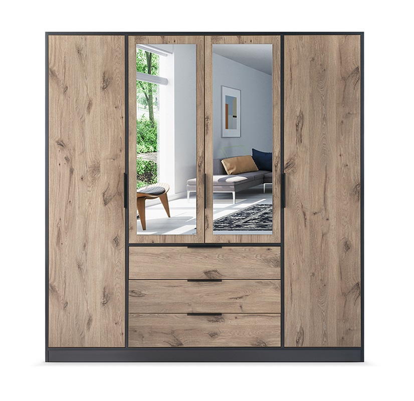 Szafa czterodrzwiowa Lati D4 z dwoma lustrami to doskonała propozycja do sypialni. Korpus wykonany w kolorze czarnym matowym, fronty wykonane w kolorze viking. Na środkowych drzwiach umieszczone zostały lustra, szafa posiada drzwi uchylne oraz trzy pojemne szuflady. Uchwyty w kolorze czarnym Szafa LAti D4 charakteryzuje się nowoczesnym i eleganckim designem. Wniosą do każdego wnętrza ciekawy wygląd, który zachwyci każdego.