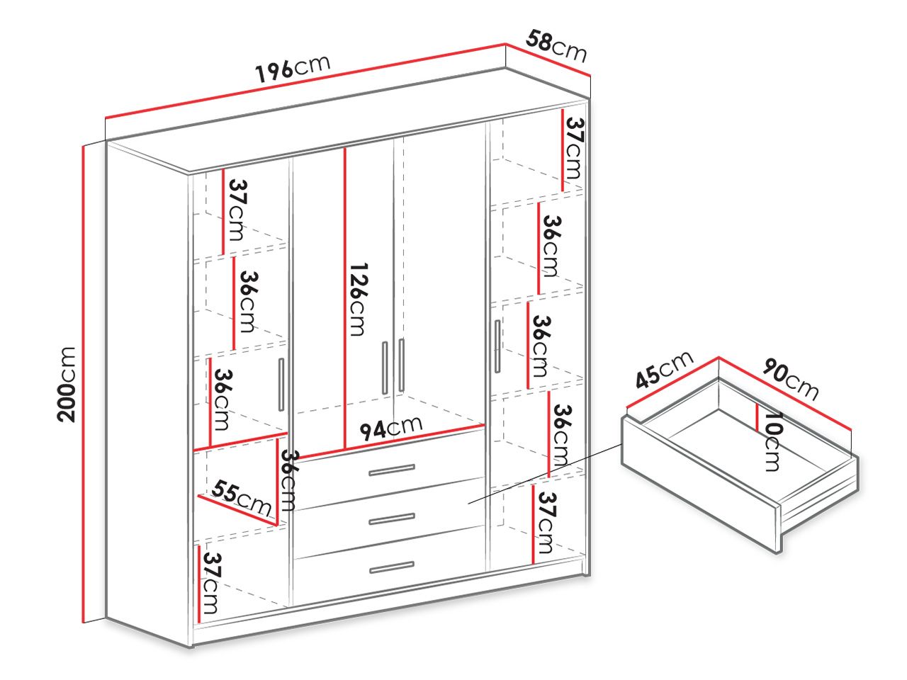 Jej wnętrze kryje drążek do wieszania ubrań o różnej długości oraz wiele półek które pomogą poskromić nieład w sypialni. Mebel wykonano z płyty wiórowej laminowanej. Do szafy Lati można zakupić dodatkowo nadstawkę Lati D4 oraz komodę Lati 2D3S z tej samej kolekcji.