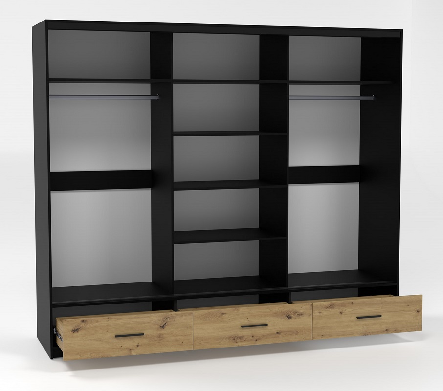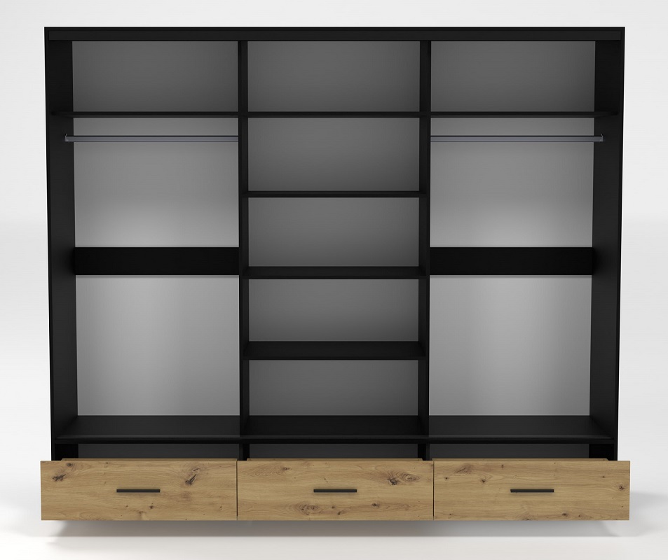 Fronty szafy utrzymane są w eleganckim kolorze dąb artisan, który nadaje meblowi naturalny, ciepły wygląd. Korpus szafy w kolorze czarnym mat doskonale komponuje się z resztą wnętrza, dodając mu nowoczesnego charakteru. To idealne połączenie barw, które nadaje szafie wyrafinowanego wyglądu.