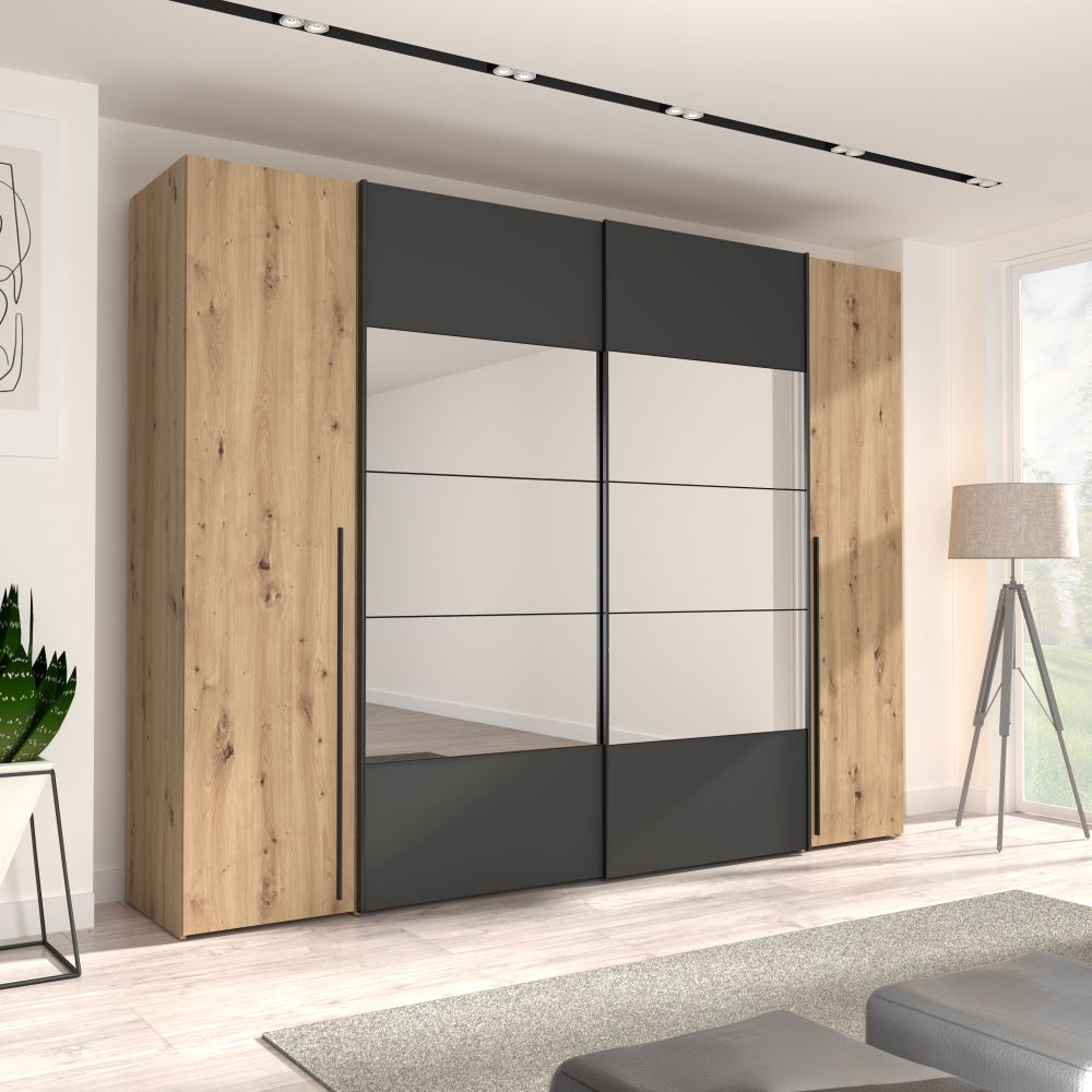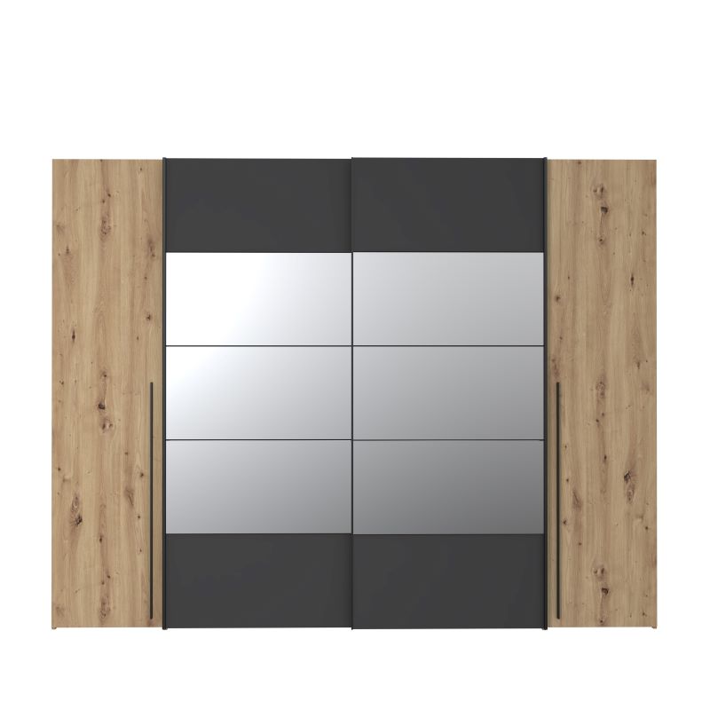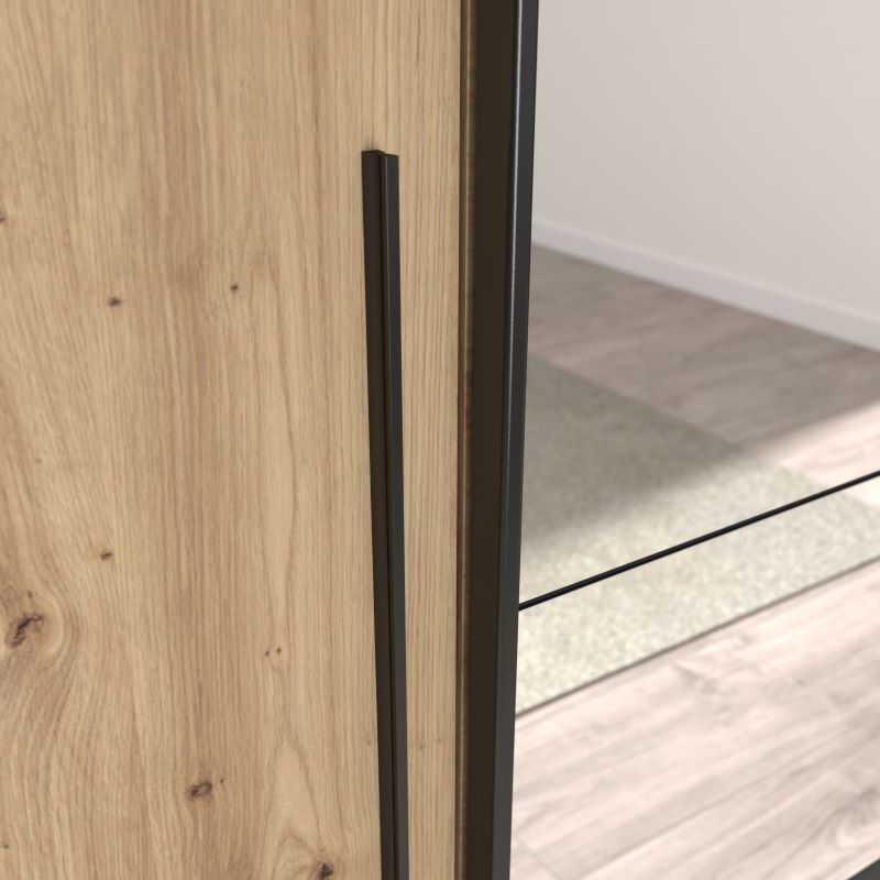 Korpus szafy utrzymany jest w eleganckim kolorze dąb artisan, nadając mu naturalny charakter. Fronty szafy w intensywnym kolorze czarnym dodają kontrastu i stylu, tworząc harmonijną całość. To połączenie barw doskonale wpisuje się w trendy wnętrzarskie, nadając pomieszczeniu nowoczesnego i przytulnego klimatu.