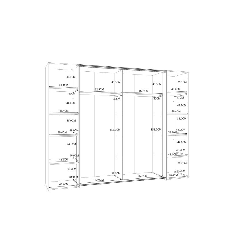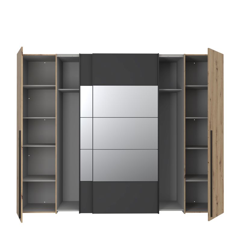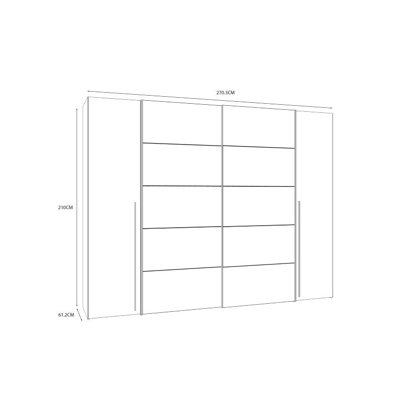 Zastosowane wymiary szafy – szerokość 270,30 cm i głębokość 61,20 cm – zapewniają odpowiednią pojemność, bez zajmowania zbyt dużo przestrzeni w pomieszczeniu. To mebel, który doskonale sprawdzi się zarówno w sypialni, jak i przedpokoju, nadając każdemu z tych miejsc elegancji i funkcjonalności.