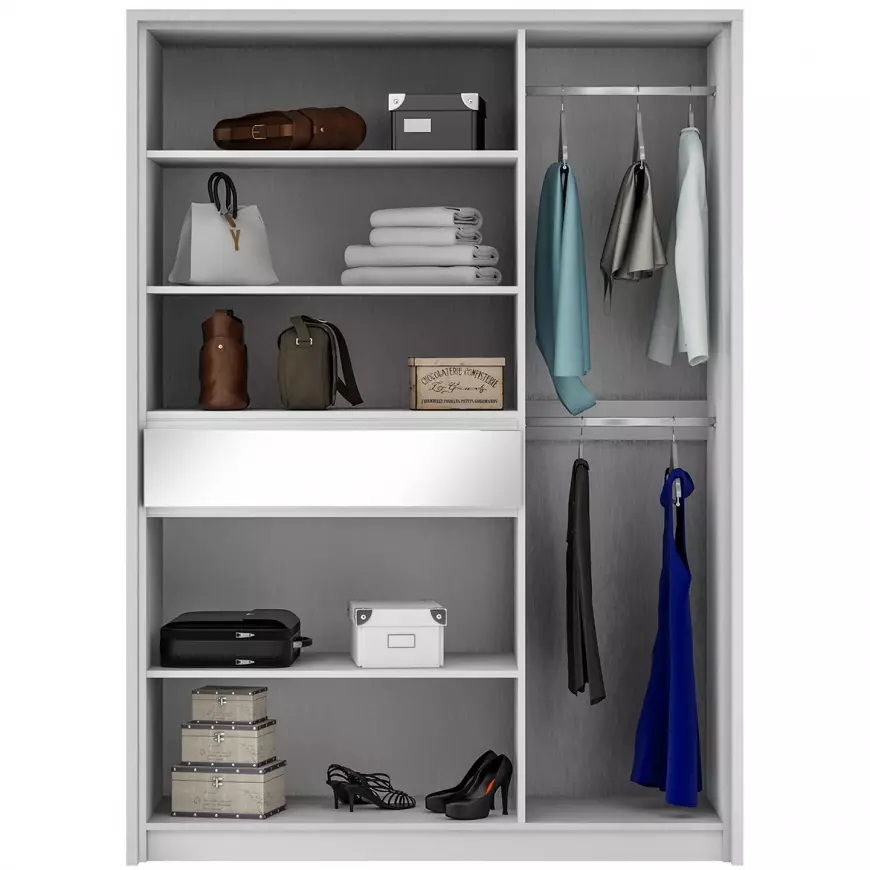 Wnętrze szafy Split 157 zostało przemyślane tak, aby jak najlepiej zorganizować przestrzeń do przechowywania ubrań i akcesoriów. W podstawowym wyposażeniu znajdują się trzy pojemne półki, które pozwalają na wygodne segregowanie odzieży oraz dwa drążki na ubrania, które idealnie sprawdzą się do wieszania koszul, sukienek czy płaszczy. Dodatkowo, szafa posiada praktyczną szufladę na mniejsze elementy garderoby, takie jak bielizna czy dodatki.